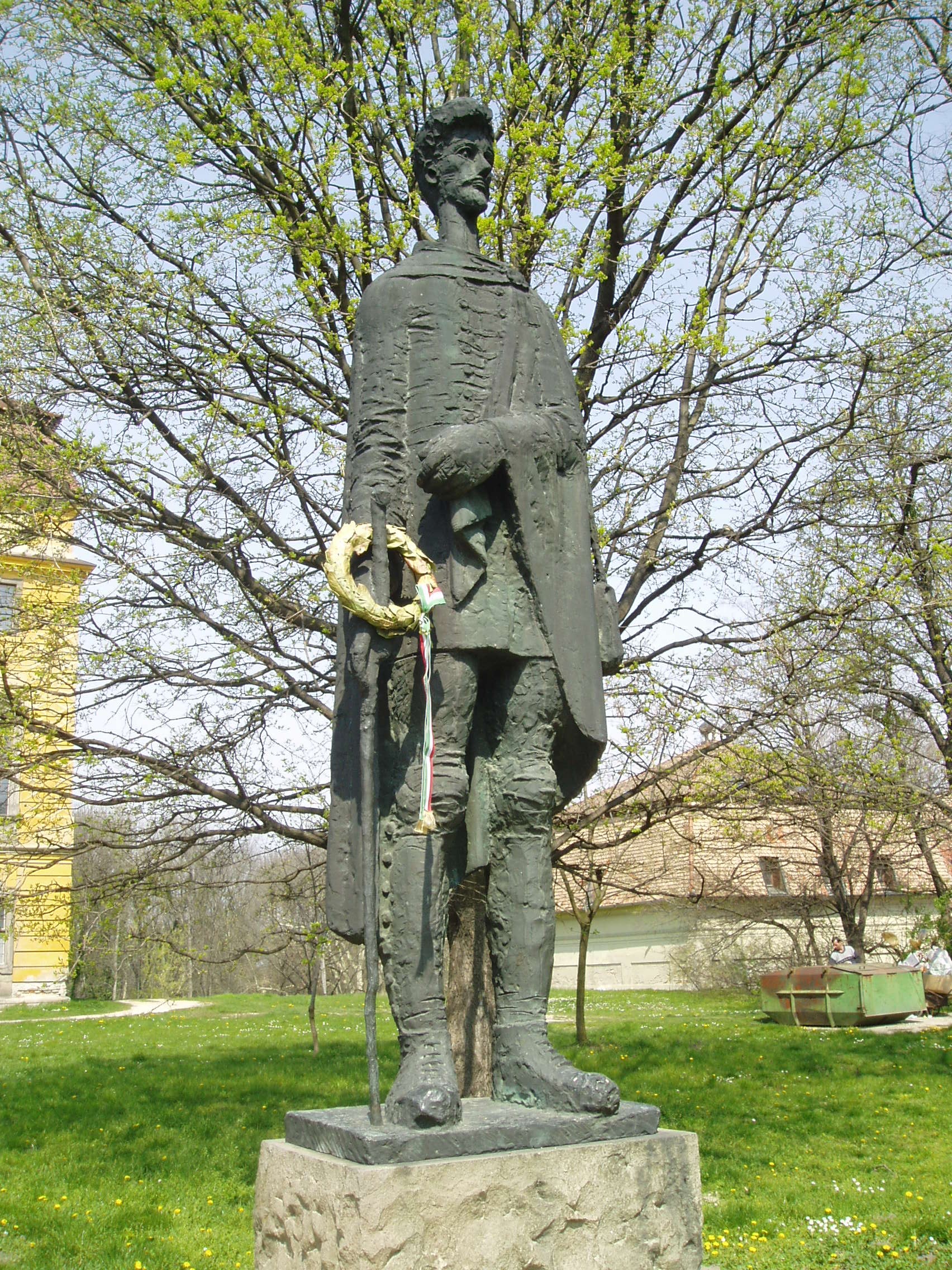 Nyilvános 1257 | 3174 | Pápa, Fő tér 1-3. Jókai-oszlop | Az Esterházy kastély előtti, a Fő tér felé néző parkban két egykori pápai diák - Jókai Mór és Petőfi Sándor - emlékére állított szoborkompozíció áll. A Petőfi Sándort megörökítő bronzszobor a szintén pápai diák Somogyi József szobrászművész alkotása. A fénykép 2007 áprilisában készült. Felh. irod.: Németh Adél - Szabó Lajos: Pápa. Bp. Panoráma, 1989 |