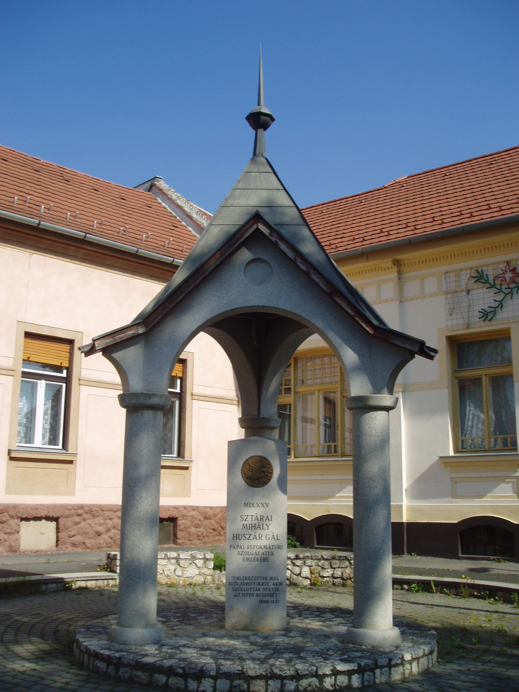 Nyilvános 1239 | 2063 | Pápa, Zimmermann utca 4. Sztárai Mihály és Huszár Gál emlékműve | Pápán szinte a reformáció kezdetétől hódítottak a protestánsok tanai. Így Sopron és Sárvár után ez a város lett a protestantizmus harmadik legjelentősebb dunántúli szellemi központja. Lelkész volt a városban Sztárai Mihály, valamint Huszár Gál és fia, Dávid. Sztárai Mihály (Drávasztára? – Pápa, 1575?), a nagy „éneklő reformátor” ferences szerzetesből lett a reformáció híve és egyik legeredményesebb terjesztője. Laskón (Tolna megye), majd Tolna városában, később Sárospatakon működött, onnét jött Pápára 1567 őszén. Hét–nyolc évet töltött itt lelkészként, utolsó éveiben Huszár Gállal együtt. Huszár Gál (1512 k. – Pápa, 1575. okt. 23.) eredetileg katolikus pap volt, de csatlakozott a reformációhoz, s a katolikus egyház kiátkozta. Egész nagyhatású munkásságát a reformáció szolgálatába állította. Zaklatott életet élt, mert az ellenreformáció többször elűzte helyéről: Magyaróvárott, Kassán, Debrecenben, Nagyszombaton, Komáromban, Rózsavölgyben, Komjátiban tevékenykedett. Élete utolsó évét töltötte Pápán, ahol 1575. október 23-án, 63 éves korában pestisben hunyt el. Halála napját állítólag korábban többször megjövendölte. Tevékenységét a városban fia, Huszár Dávid folytatta, aki 1577-ben itt nyomtatta ki a Heidelbergi Káté első magyar fordítását. Sztárai Mihály és Huszár Gál közös emlékművét a Zimmermann utca 4. számú épület előtt állították fel, közel az Anna térhez, amelynek azóta felszámolt temetőjében nyugodtak a hagyomány szerint Huszár Gál hamvai. A fénykép 2007 áprilisában készült. Felh. irod.: Németh Adél – Szabó Lajos: Pápa. Bp. Panoráma, 1989 Pápa. Szerk. Sz. Farkas Aranka. 2. kiad. Veszprém-Bp., Magyar Képek, 2000. http://church.lutheran.hu/reformatio/ppanteon/pp_ev_huszar_gal.htm Fabiny Tibor: Az evangélikusok Pápán. = w.mek.iif.hu/porta/szint/tarsad/tortenel/helytort/papa_1 |