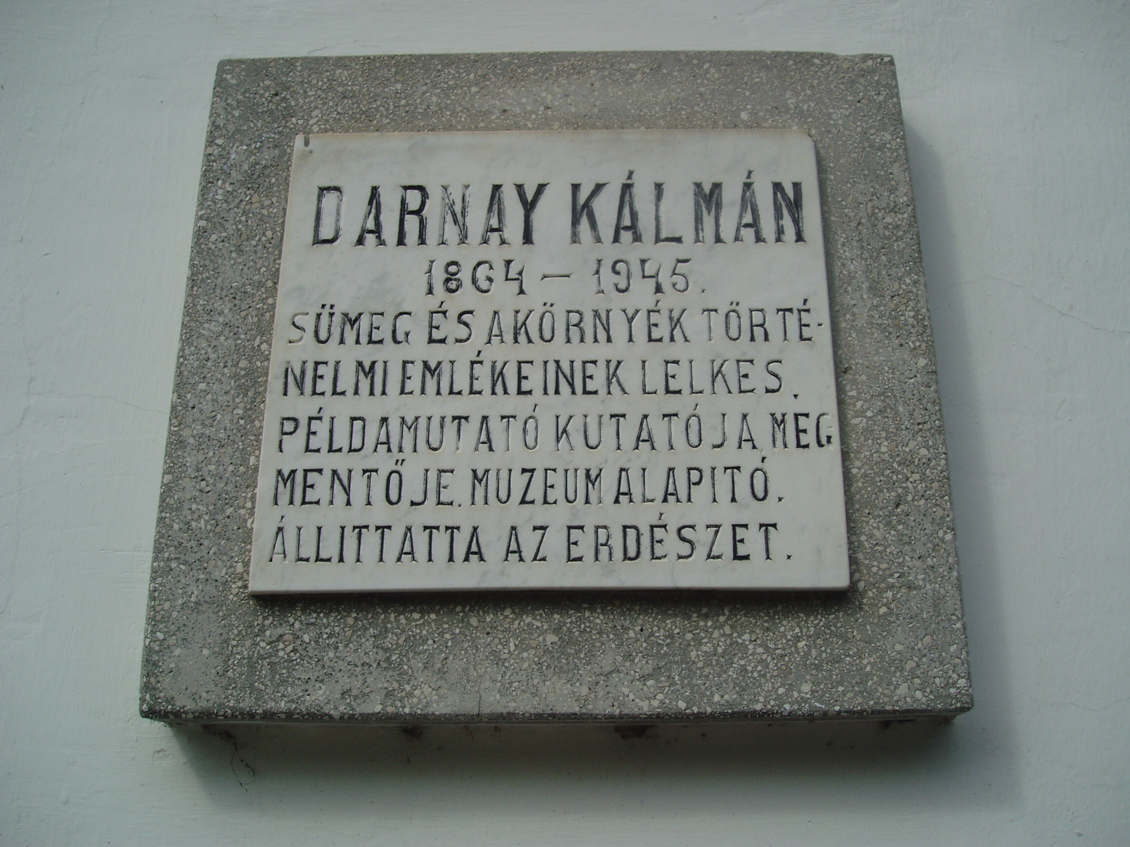 Nyilvános 1203 | 1762 | Sümeg, Panteonfal. Darnay Kálmán emléktáblája | A Kisfaludy téren, Kisfaludy Sándor szülőháza előtt alakították ki Sümeg Panteonfalát. A képen Darnay Kálmán emléktáblája látható (1955). Felirata: DARNAY KÁLMÁN 1864-1945 Sümeg és a környék történelmi emlékeinek lelkes, példamutató kutatója, megmentője, múzeumalapító. Állíttatta az Erdészet Darnay Kálmán (Sümeg, 1864. máj. 11. – Sümeg, 1945. júl. 3.) író, régész, múzeumalapító. Sümegi és grázi tanulmányok után vaskereskedőként kezdte pályáját, de igazi szenvedélye a régészet volt. Sümeg környékén jelentős ásatásokat folytatott, az ő műve a csabrendeki és a somlói urnatemető feltárása. Ezek leletek képezték gyűjteményének alapját, amelyet 1907-ben az államnak ajándékozott - sajnos, nagy része 1945-ben megsemmisült. A fénykép 2007 júniusában készült. Felh. irod.: Koppány Tibor - Kozák Károly: Sümeg útikalauz. Veszprém, Idegenforgalmi Hivatal, 1965 Látnivalók Veszprém megyében. Miskolc, Well-PRess, 2004 Veszprém megyei életrajzi lexikon. Veszprém, Veszprém Megyei Önkormányzat Közgyűlése, 1998 www.ekmk.hu/emlekhely/Emlekhelyek.html |