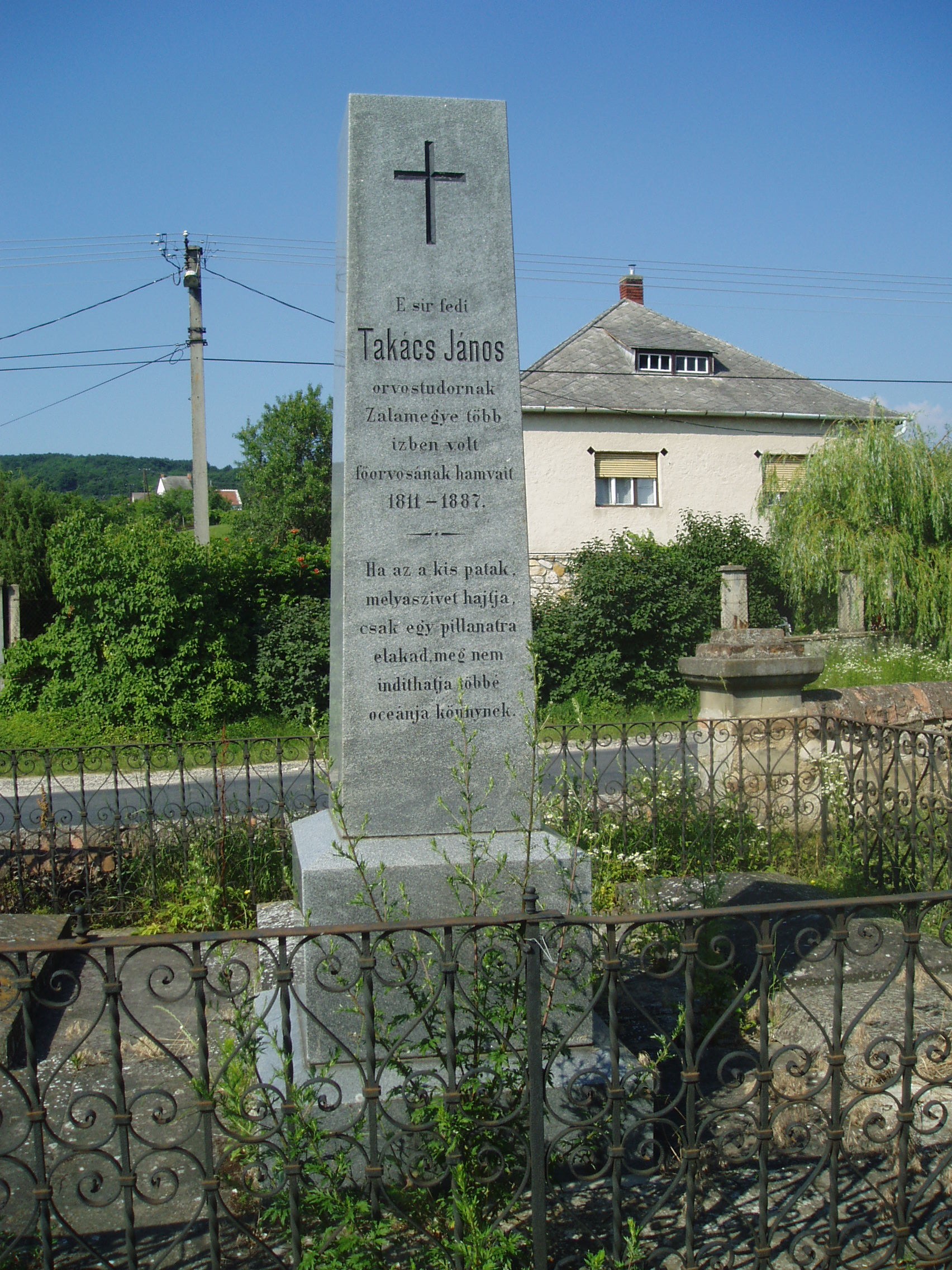 Nyilvános 1067 | 1809 | Sümeg, Temető. Takács János sírja | Sümeg délkeleti határában, a Tapolcára vezető út mellett emelkedő lankás domboldalon találjuk a város köztemetőjét. Helyét még Bíró Márton püspök jelölte ki; jelentősebb számban a XIX. század eleje óta kezdtek ide temetkezni. A temetődomb tetején áll az 1816-ban épített, későbarokk stílusú temetőkápolna. Körülötte a sümegi élet utolsó két évszázada szinte valamennyi híres személyiségének sírja fellelhető. Itt nyugszik Takács János (1811-1887) orvostudor, Zala megye egykori főorvosa. Sümegre az 1830-as években került, ahol háziorvosa lett az idősödő Kisfaludy Sándornak. A fénykép 2007 júniusában készült. Felh. irod.: Koppány Tibor - Kozák Károly: Sümeg útikalauz. Veszprém, Idegenforgalmi Hivatal, 1965 Sümegi kalauz. Sümeg, Sümegi Fórum Alapítvány, 1993 Miklósi-Sikes Csaba: Kőbe vésett történelem. A sümegi városi temetők története és sírjelei 1950-ig. Sümeg, Sümegi Fórum Alapítvány, 2002 Veszprém megyei életrajzi lexikon. Veszprém, Veszprém Megyei Önkormányzat Közgyűlése, 1998 |