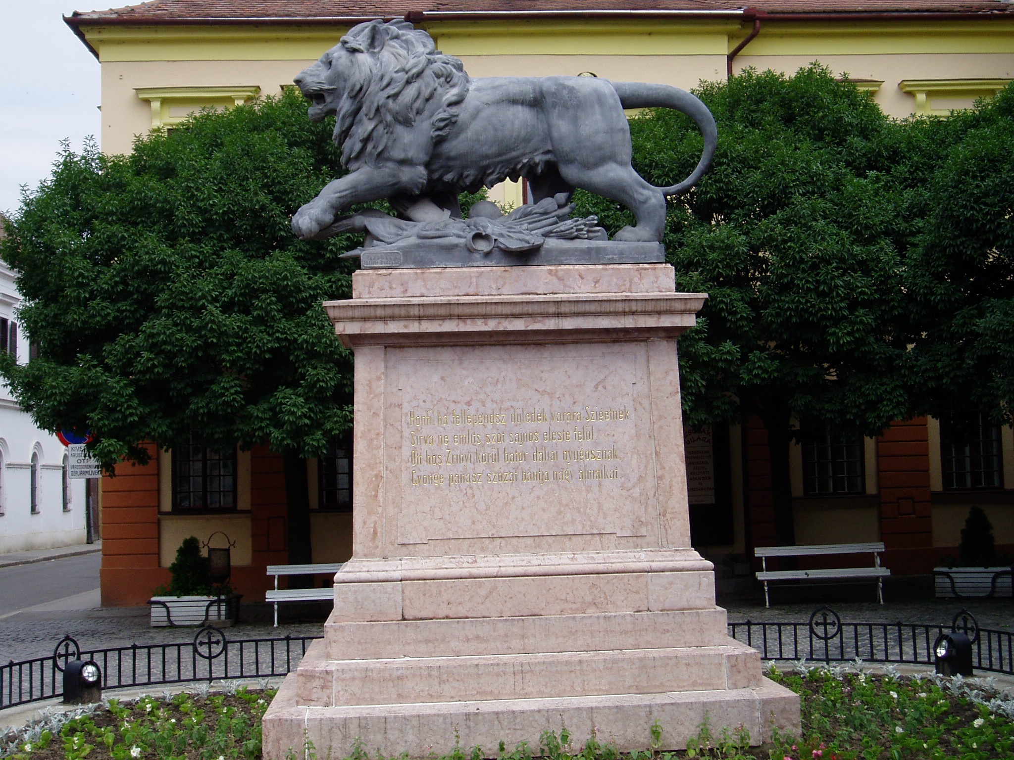 Nyilvános 1252 | 2112 | Szigetvár, Zrínyi tér: Oroszlános emlékmű | Zrínyi Miklós és a szigetvári hősök tiszteletére 1878-ban állították fel a Zrínyi tér északi részén az ún. oroszlános emlékművet. A szobor talapzatán Vörösmarty Mihály sorai olvashatók: "HONFI, HA FELLÉPENDSZ DÜLEDÉK VÁRÁRA SZIGETNEK, / SÍRVA NE EMLÍTS SZÓT SAJNOS ELESTE FELŐL, / OTT HŐS ZRÍNYI KÖRÜL BÁTOR DALIÁK NYUGOSZNAK, / GYÖNGE PANASZ SZÓZAT BÁNTJA NAGY ÁLMAIKAT." A fénykép 2005 júniusában készült. Felh. irod.: Látnivalók Pécsett és Baranyában. Miskolc, Well-PRess, 1998 |