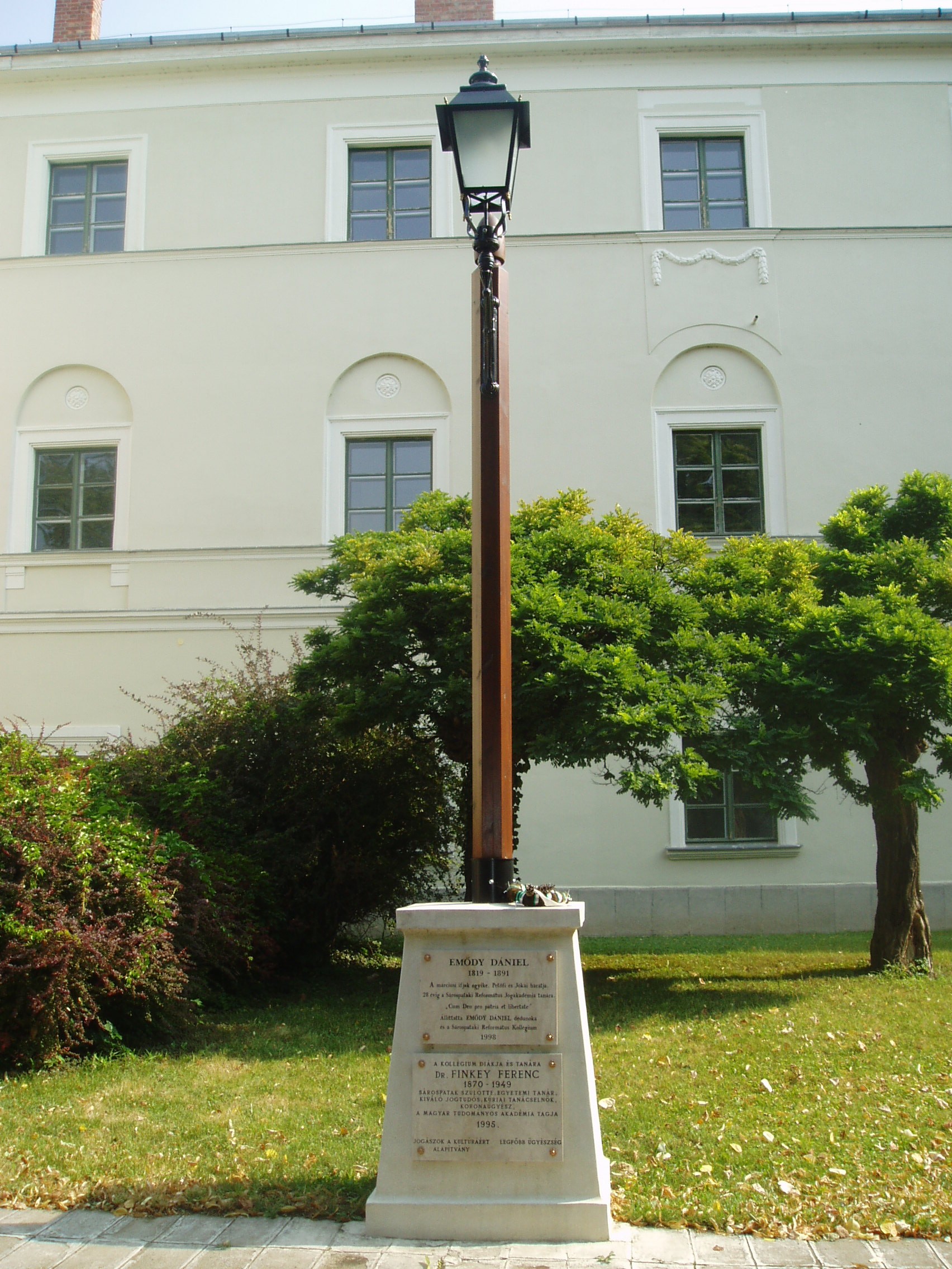 Nyilvános 1111 | 1639 | Sárospatak, Rákóczi utca 1. Református Kollégium | A kollégium főépülete, a Nagy Kollégium a Rákóczi út északi végén található, mely 1804–1814 között korai klasszicista stílusban épült. Szép ráccsal ellátott, háromíves nyílású kapuzaton át jut a látogató az udvarra. Az 1990-es évek közepétől helyeznek el emléktáblákat az itt felállított kandeláberek talapzatán. Az első emléktábla Emődy Dániel (1819-1891) alakját idézi. A márciusi ifjak egyike, Petőfi és Jókai barátja 28 évig volt a Református Jogakadémia tanára. A második táblát Dr. Finkey Ferenc (1870-1949) kiváló jogtudós, koronaügyész, egykori pataki diák emlékére állították. A fénykép 2007 augusztusában készült. Felh. irod.: Détsy Mihály: Sárospatak. Bp. Corvina, 1974 Látnivalók Borsod-Abaúj-Zemplén megyében. Miskolc, Well-PRess, 1995 www.sarospatak.hu/nevezetessegek |