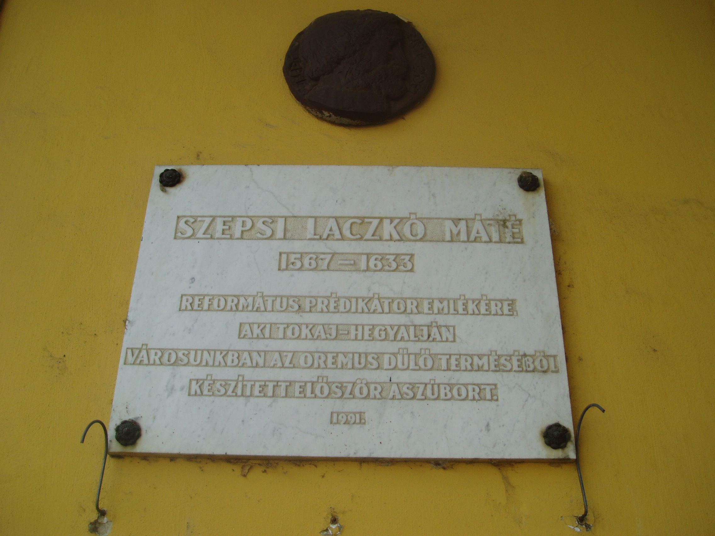 Nyilvános 1124 | 1661 | Sátoraljaújhely, Kossuth tér 24. | A város fő terének egyik szép, régi épületén elhelyezett emléktábla szerint elsőként Sátoraljaújhelyen készített tokaji aszút 1631 körül Szepsi Laczkó Márton (1567-1633) református prédikátor, Lórántffy Zsuzsanna udvari lelkésze a fejedelemasszony számára az Oremus dűlő terméséből. A hagyomány szerint az országot érő támadások miatt későn szüretelt szőlő tartalmazott olyan „beteg” szőlőszemeket is amelyeket ma az aszú készítéséhez használnak. Az elkészült, miseborként is használt italban fedezte fel Szepsi Laczkó Máté a különleges ízvilágot és ajánlotta fel a bort a fejedelemasszonynak. Az aszú készítésének első leírását is neki tulajdonítják. A hagyománynak azonban ellentmond, hogy már az 1590-es években - Szikszai Fabricius Balázs latin–magyar szótárában - használták az „aszú szőlő” kifejezést. A fénykép 2007 augusztusában készült. Felh. irod.: www.tokaj.hu/magyar/atokaji/az-aszu/index.php |
