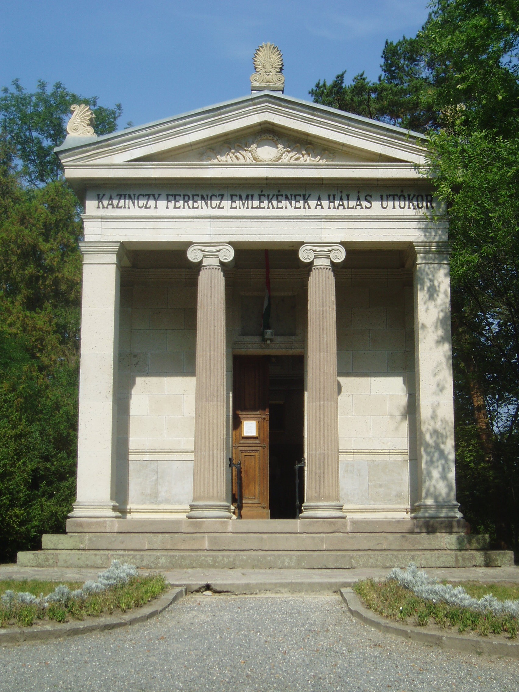 Nyilvános 1140 | 1714 | Széphalom: Kazinczy Ferenc Emlékcsarnok (Mauzóleum) | A Sátoraljaújhely központjától 5 km-re található, ma a városhoz csatolt Széphalom neve egykor Kisbányácska volt; a nyelvújító Kazinczy Ferenc nevezte el Széphalomnak. Valaha körülbelül ezen a helyen állt Kazinczy kúriája, amelyet irodalmunk nagy alakja 1794-ben kezdett el építeni. A következő évben letartóztatták a magyar jakobinus mozgalomban betöltött szerepe miatt. Előbb halálra, majd várfogságra ítélték több helyen, köztük Kufsteinben és Munkácson raboskodott. Több, mint 7 év után, 1801-ben kapott kegyelmet. 1804-ben költözött Széphalomra feleségével, Török Sophie-vel, s haláláig itt élt gyarapodó családja körében - sajnos, élete végéig anyagi gondok között. Innét irányította az irodalmi életet két évtizeden át, s ezzel a kis települést a magyar irodalmi-politikai gondolkodás egyik központjává tette. Óriási levelezése folytán Kazinczy a kor valamennyi jelentős gondolkodójával kapcsolatban állt, itt futottak össze a haladó társadalmi eszmék, az irodalmi reformtörekvések és a nyelvújítási folyamatok. 1815-től élete végéig Zemplén megye levéltárnokaként tevékenykedett (lásd: Sátoraljaújhely, Kossuth tér 5.). Széphalmi otthonában halt meg 1831. augusztus 22-én, a környéken pusztító kolerajárvány áldozataként. A közelben lévő családi temetőben helyezték örök nyugalomra (lásd a 04-10. képeket). Nyughelye már a reformkorban zarándokhely lett. 1859-ben, születése centenáriumának évében a Magyar Tudományos Akadémia megvásárolta a széphalmi kúria kertjét, s 1873-ra felépítették egykori otthona helyén Ybl Miklós tervei szerint a görög templomot mintázó Kazinczy Ferenc Emlékcsarnokot. A fénykép 2007 augusztusában készült. Felh. irod.: Sátoraljaújhely-Széphalom: A Magyar Nyelv Múzeuma (szórólap, 2006 k.) www.vendegvaro.hu |