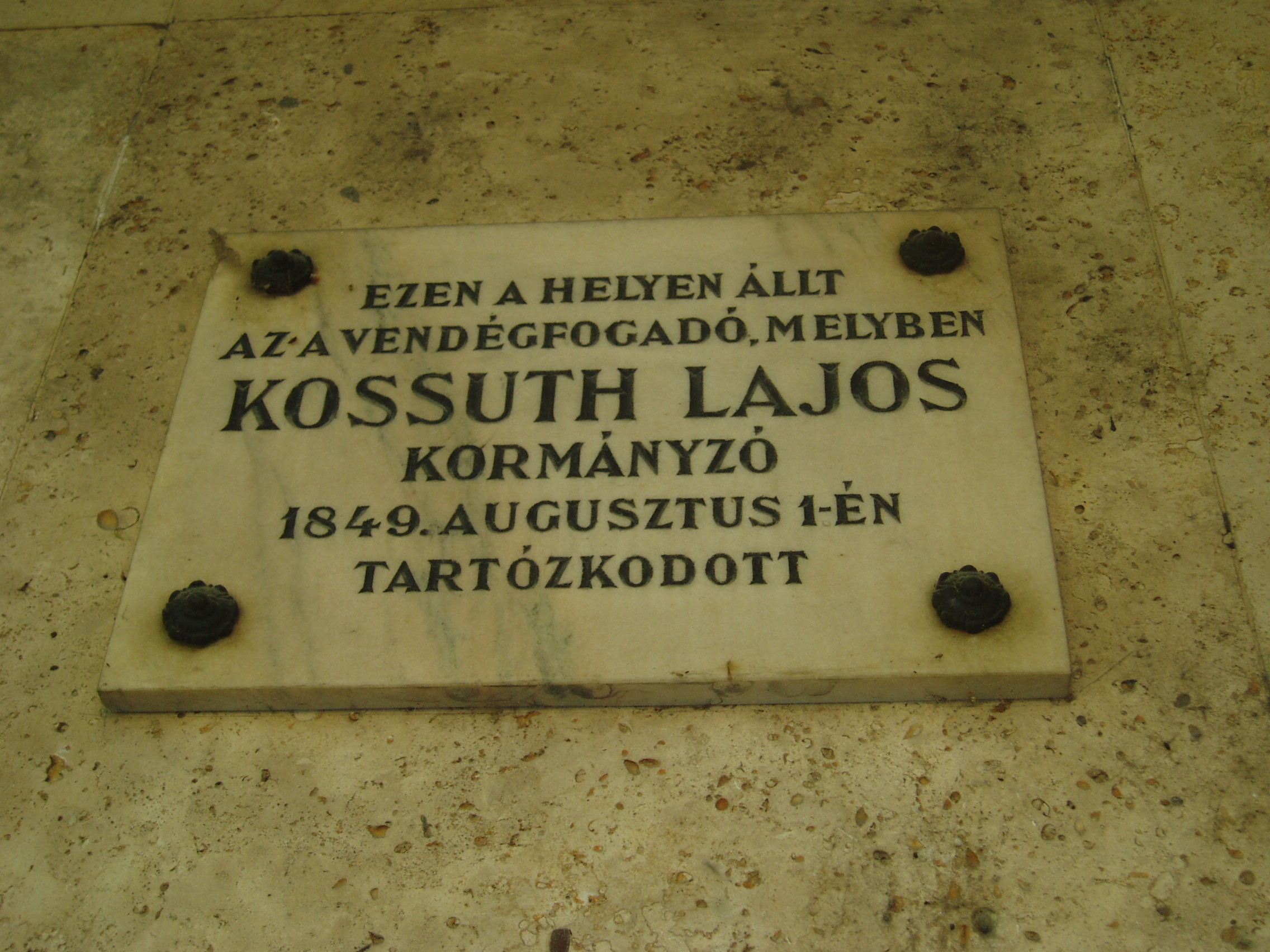 Nyilvános 1121 | 1479 | Makó, Széchenyi tér 15. | A Széchenyi teret déli oldalról az 1970-ben épült ún. csipkeházsor határolja, földszintjén üzletekkel. Rajta feliratos tábla idézi Kossuth Lajos emlékét, aki 1849. augusztus 1-jén a jelenlegi ház helyén álló hajdani fogadó vendége volt. A fénykép 2007 júliusában készült. Felh. irod.: Barangolások Csongrád megyében. Miskolc, Well-PRess, 1997 |