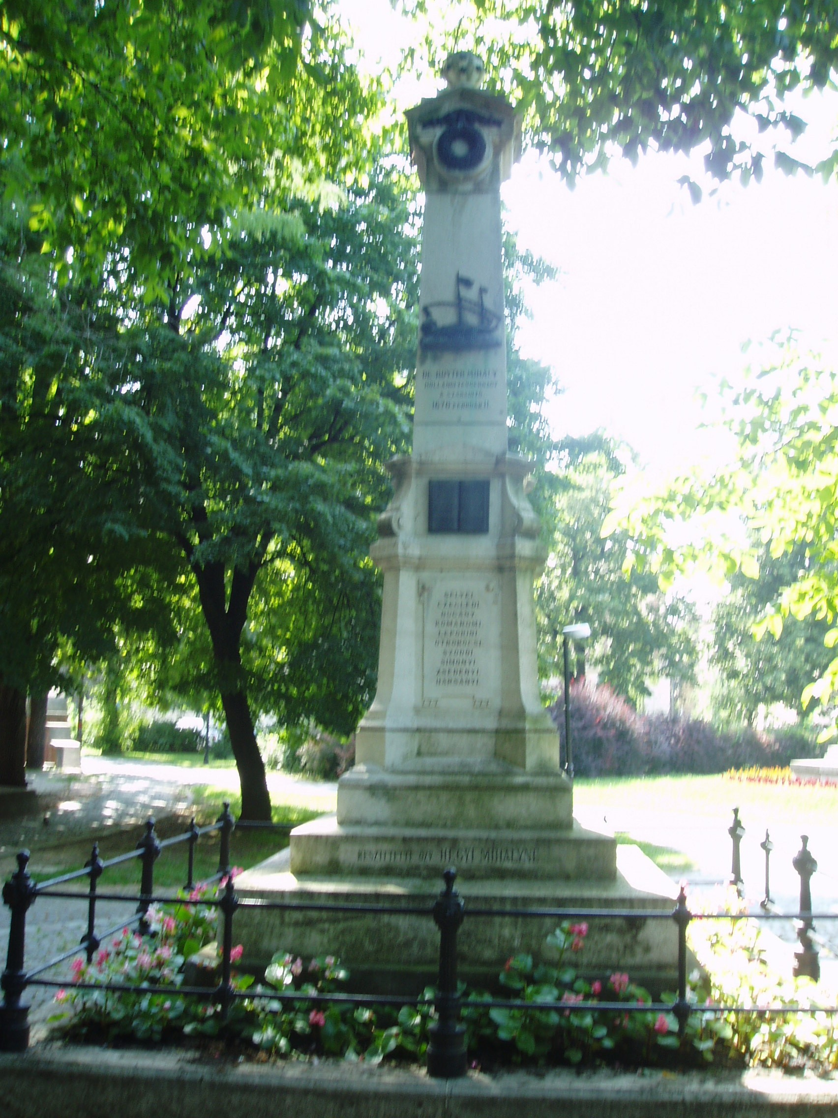 Nyilvános 1192 | 2039 | Debrecen, Emlékkert: Gályarabok emlékoszlopa | A Nagytemplom és a Kollégium között húzódik az Emlékkert. 1895-ben itt állították fel a Gályarabok emlékoszlopát. Az oszlop azoknak a református papoknak és tanítóknak emlékét őrzi, akiket a Wesselényi-összeesküvés leleplezése után I. Lipót császár ítélt gályarabságra 1673-ban. Az ellenreformáció áldozatait 1676. február 11-én Ruyter holland admirális váltotta ki a rabságból és küldte haza. Az emlékoszlopot özvegy Hegyi Mihályné állíttatta. Négy oldalán a gályarabságot túlélt és hazatért negyven református pap, illetve tanító nevét vésték fel. Köztük a Jablonczai név is olvasható: viselője Szabó Magda írónő egyik őse. Szabó Magda több könyvében is ír erről (Ókút, Régimódi történet). A fénykép 2006 júniusában készült. Felh. irod.: Kovács Gergelyné: Debrecen. Bp. Panoráma, 1981 Papp Antal: Debrecen. Bp. Panoráma, 1976 |