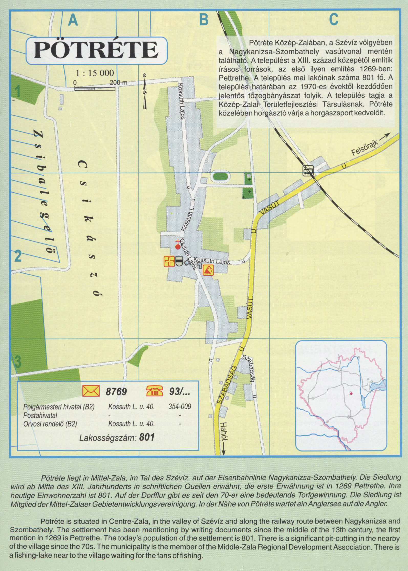 Nyilvános 2401 | 6959 | PÖTRÉTE | Pötréte Közép-Zalában, a Szévíz völgyében a Nagykanizsa-Szombathely vasútvonal mentén található. A települést a XIII. század közepétől említik írásos források, az első ilyen említés 1269-ben: Pettrethe. A település mai lakóinak száma 801 fő. A település határában az 1970-es évektől kezdődően jelentős tőzeg bányászat folyik. A település tagja a Közép-Zalai Területfejlesztési Társulásnak. Pötréte közelében horgásztó várja a horgászsport kedvelőit. Pötréte liegt in Mittel-Zala, im Tal des Szévíz, auf der Eisenbahnlinie Nagykanizsa-Szombathely. Die Siedlung wird ab Mitte des XIII. Jahrhunderts in schriftlichen Quellen erwähnt, die erste Erwähnung ist in 1269 Pettrethe. Ihre heutige Einwohnerzahl ist 801. Auf der Dorfflur gibt es seit den 70-er eine bedeutende Torfgewinnung. Die Siedlung ist Mitglied der Mittel-Zalaer Gebietentwicklungsvereinigung. In der Nähe von Pötréte wartet ein Anglersee auf die Angler. Pötréte is situated in Centre-Zala, in the valley of Szévíz and along the railway route between Nagykanizsa and Szombathely. The settlement has been mentioning by writing documents since the middle of the 13th century, the first mention in 1269 is Pettrethe. The today\'s population of the settlement is 801. There is a significant pit-cutting in the nearby of the village since the 70s. The municipality is the member of the Middle-Zala Regional Development Association. There is a fishing-lake near to the village waiting for the fans of fishing. A részlet a következő kiadványból származik/Die Teile stammen vom volgenden Buch/This text came from the following book: Cím/Titel/Title: Zala megye településeinek atlasza - 257 település részletes térképe/Atlas der Komitat Zala - 257 Detailte Siedlungskarten/Zala county\'s Atlas - 257 settlement maps. Közreműködő/contributor: Lackner László (1943) (fotó) Kiadás/Ausgabe/Publisher: Gyula : HISZI-MAP, 1997 Sorozat/Serie/Series: Indulástól - megérkezésig... ETO: 912(439.121-2) ; 908.439.121 Cutter: Z 19 ISBN: 963-610-025-4 Oldalszám/Seiten/Pages: 323, 81 p. Megjegyzés/Note: Lezárva/Abgeschlossen am/Closed am: 1997. máj. 30. |