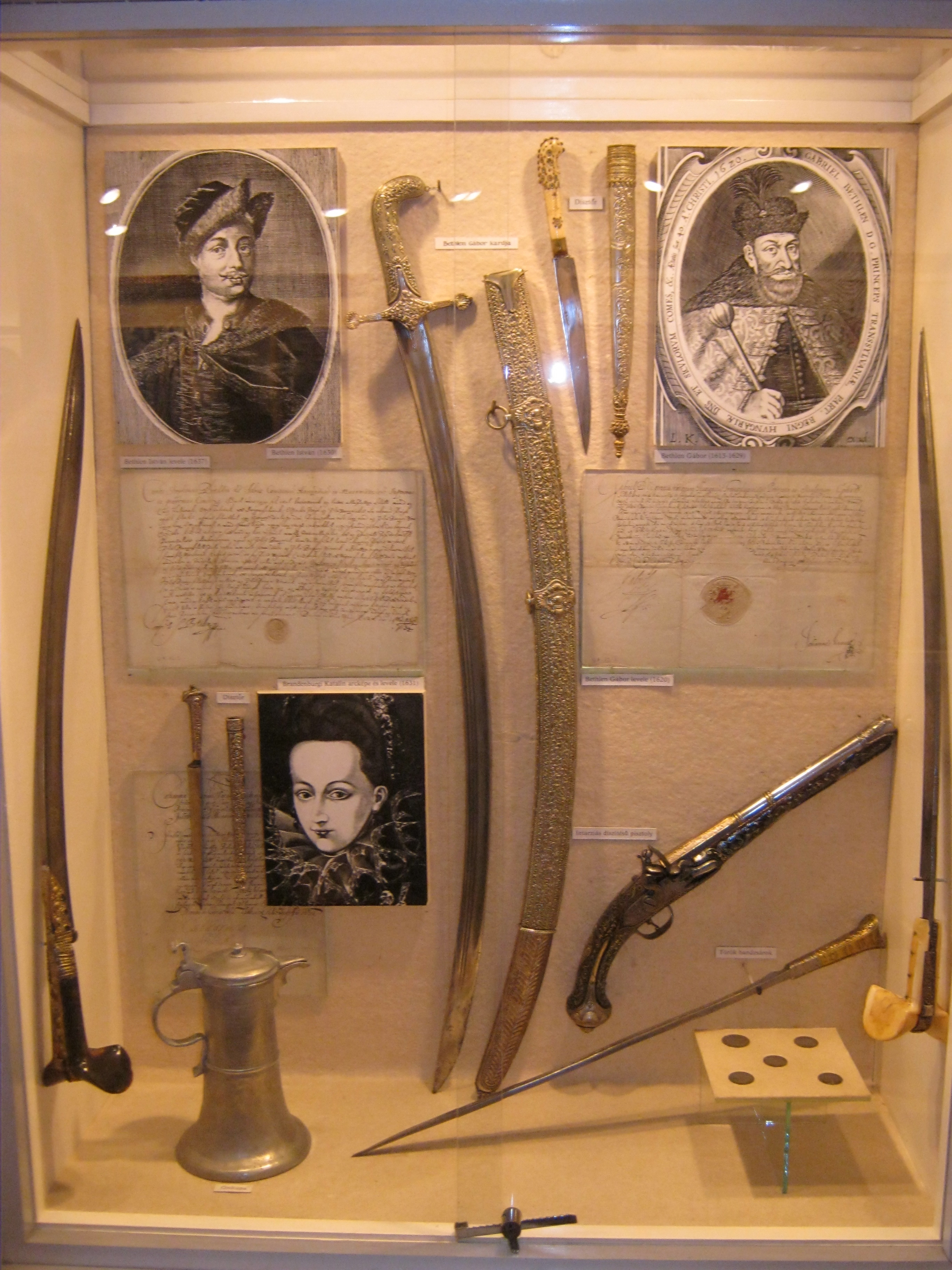 Nyilvános 1086 | 1448 | Nyírbátor, Károlyi utca 21. Báthori István Múzeum | A minorita kolostor épültét 1959-ben kapta meg a múzeum. Első igazgatója, Szalontai Barnabás áldozatos munkája nyomán két év múlva már meg is nyílhatott benne az első kiállítás. A képen Bethlen Gábor relikviái: középen kardja, jobbra egy 1620-ból származó levele, balra pedig második felesége, Brandenburgi Katalin 1631-ben írott levele, alatta arcképével. Felh. irod.: Látnivalók Szabolcs-Szatmár-Bereg megyében. Miskolc, Well-PRess, 1999 www.nyirbim.hu |