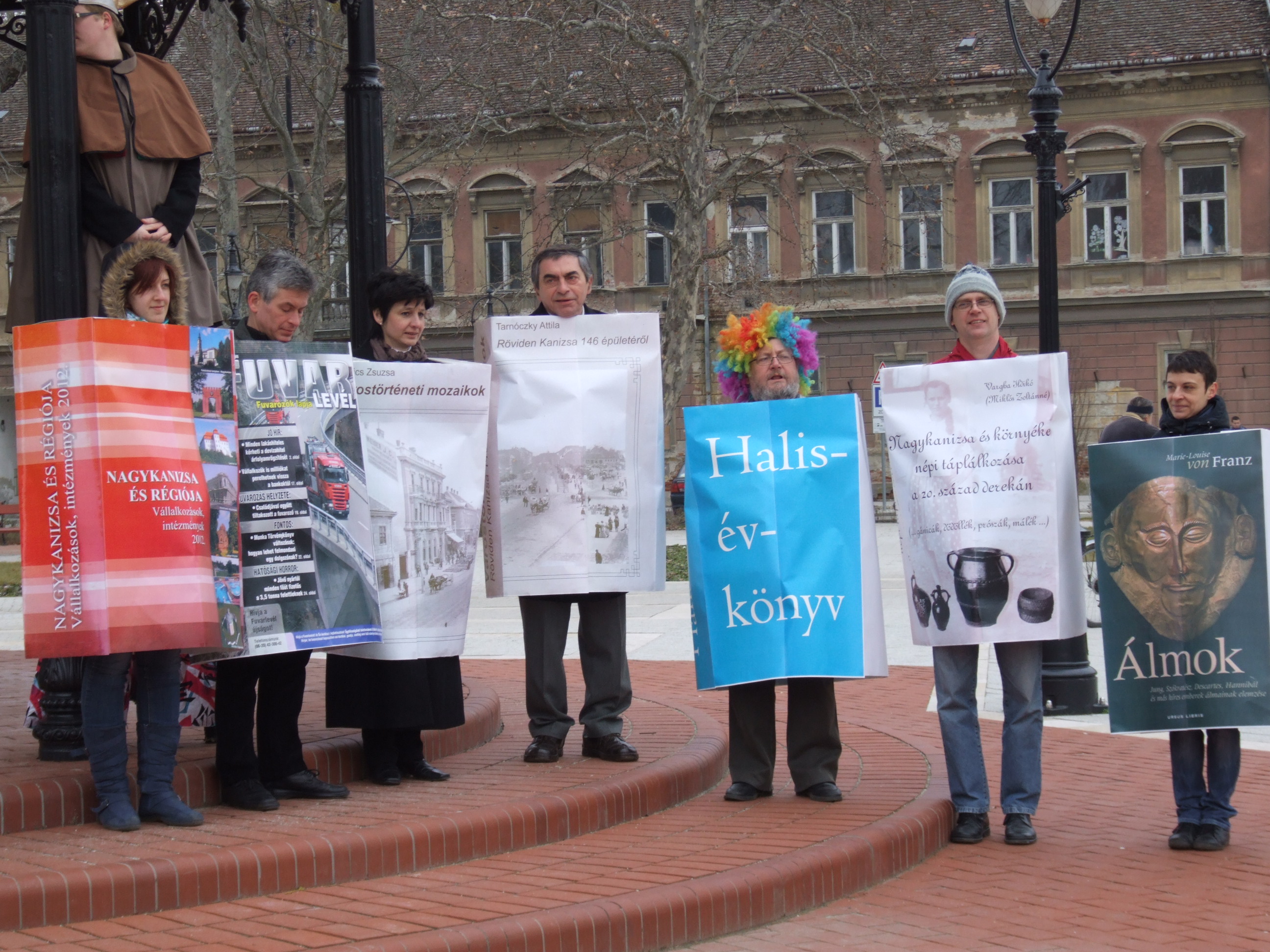 Nyilvános 1086 | 1430 | 2013. február 9. A farsangi fánkfesztiválra készülve felhívásban kértük olvasóinkat, hogy öltsék magukra kedves könyvüket. Egy „könyvespolcnyi” jelentkező vette magára kedves olvasmányát, az ő vonulásukról készültek ezek a képek. A környezetükben néhol láthatók a Nagykanizsai Gólyalábasok, akik szintén a könyvtárhoz kötődnek. A „felvonuló kötetek” a könyvtár épületében még megtekinthetők. | |