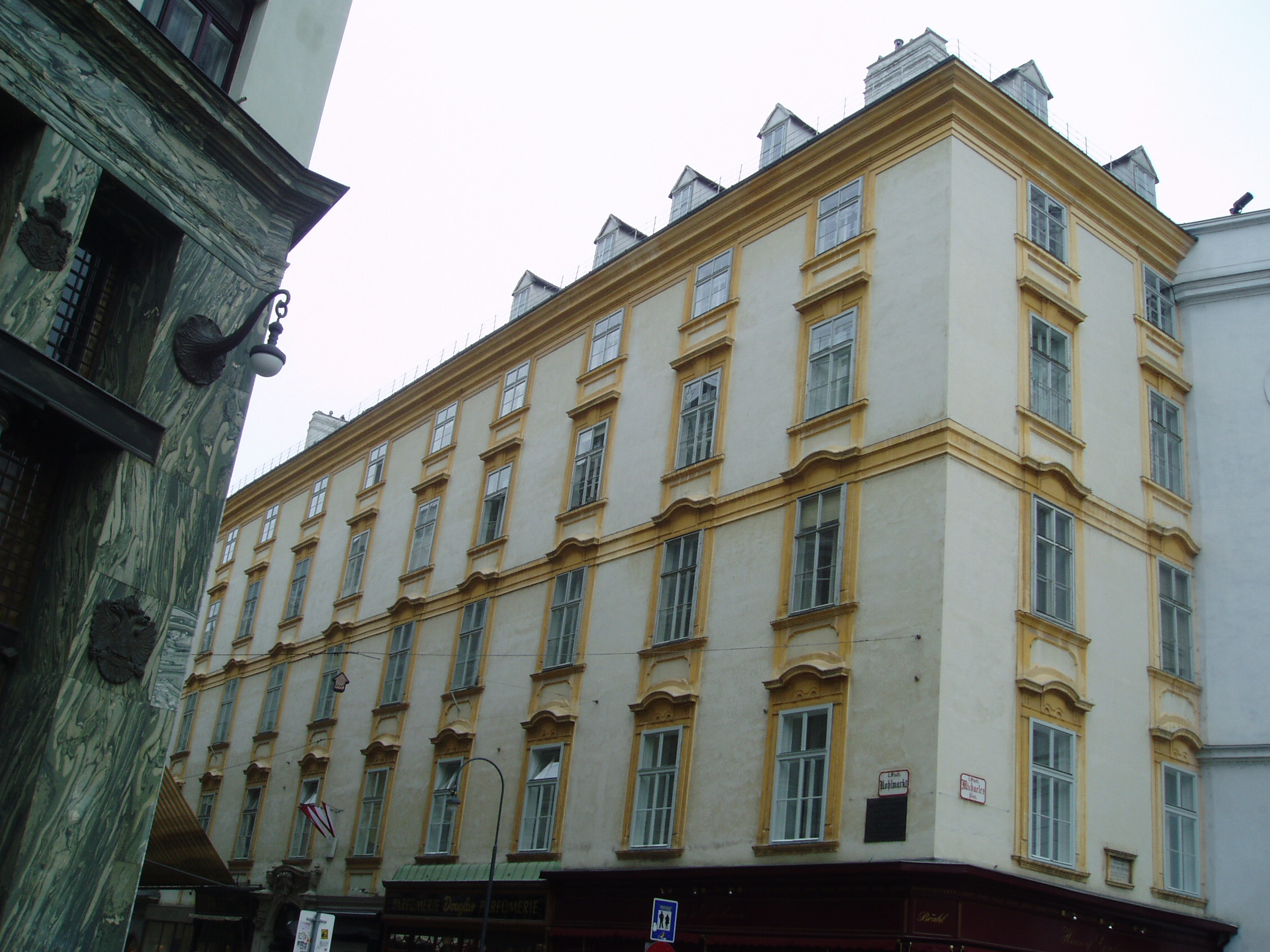 Nyilvános 1525 | 2368 | Kohlmarkt 11.Grosses Michaelerhaus | A "nagy" Szent Mihály-ház Bécs belvárosában, a Burghoz közel, a Szent Mihály templom (lásd: Michaelerplatz 1.) tőszomszédságában áll. Belső udvarán középkori összevisszaságban tapadnak egymáshoz és a szomszédos templom falához a kisebb-nagyobb toldaléképületek. Ebben a házban lakott 1750 és 1757 között a fiatal Joseph Haydn. Nyimorúságos padlásszobácskája volt itt, fűteni nem lehetett, s a rossz tetőszerkezeten át gyakran beesett hozzá az eső. Ekkoriban a szomszédos templom orgonistájaként működött. Vele egyidőben ugyanebben a házban lakott Pietro Metastasio, az udvari költő, és Nicola Porpora, a kitűnő muzsikus, énektanár. |