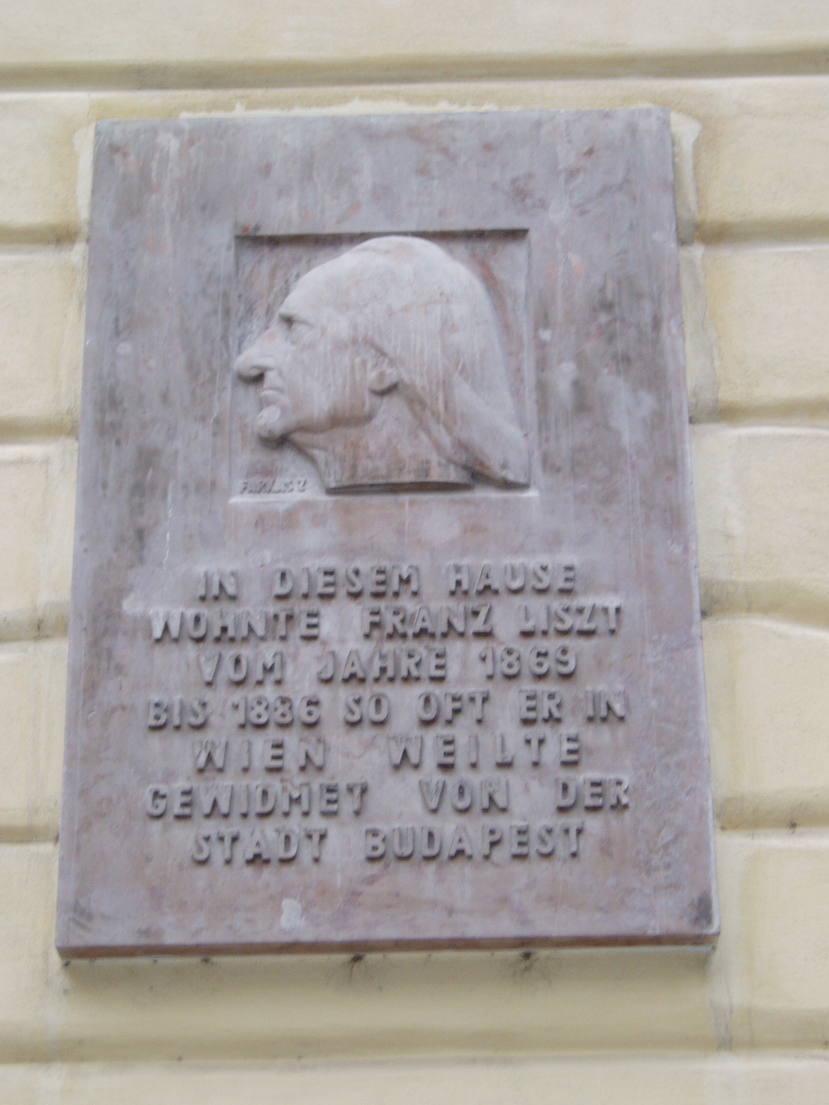 Nyilvános 1894 | 3815 | Freyung 6. Liszt-emléktábla | A Schottenhof épületegyüttesének a kert végében elhelyezett szárnyépülete homlokzatán a Farkas Zoltán alkotta dombormíves emléktáblán olvasható, hogy „e házban lakott Liszt Ferenc 1869-86 között, valahányszor Bécsben tartózkodott”. A táblát Budapest városa adományozta. |