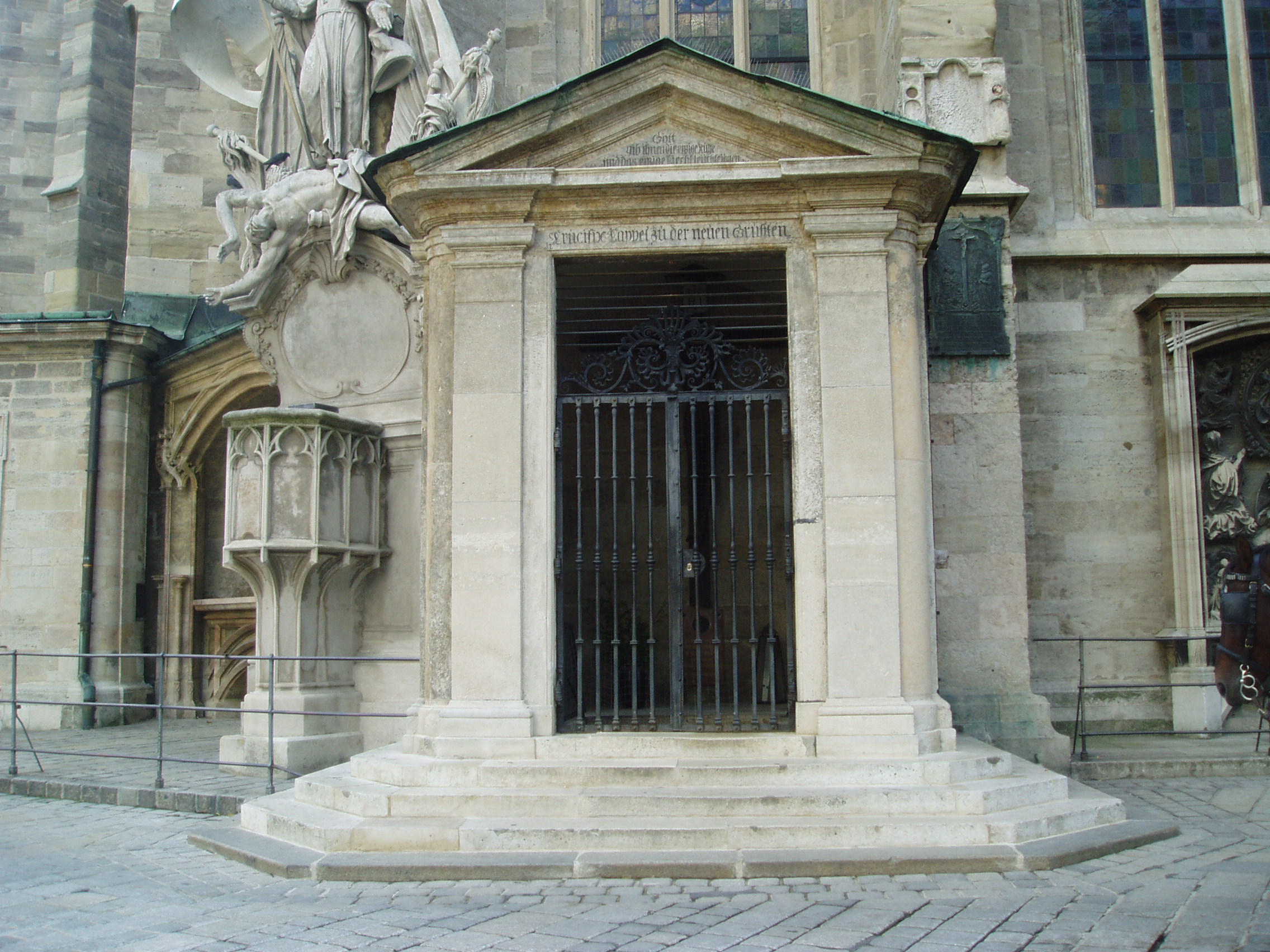 Nyilvános 1580 | 2897 | Ha kívülről megkerüljük a Stephansdom épületét, a hátsó oldalánál, ahol a fiákeresek gyülekeznek, egy kis oldalkápolnát találunk. Itt ravatalozták fel a beszentelés után Mozart holttestét és innét vitték ki a St.Marx-temetőbe, hogy aztán sírhelye örökre feledésbe merüljön. Ha benézünk a kápolna rácsain, Mozart emléktábláját olvashatjuk. | |