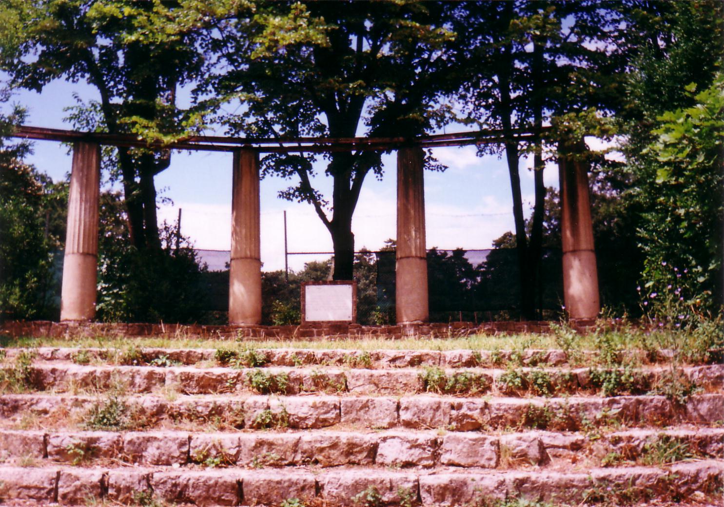 Nyilvános 1856 | 6278 | Balatonfüred, Kiserdő | A Fenyvespark néven is ismert terület Balatonfüred központjában, a Gyógy tér mögött terül el. Az 1800-as évek közepétől az első világháborúig egymást követően két nyári színkör is működött itt. Bár Fürednek 1831-től volt állandó kőszínháza, az épület azonban nagyon levegőtlen volt, ezért nyári játszóhelyet is létesítettek. A legtöbbet Latabár Endre és Molnár György társulatai szerepeltek itt. 1958 őszén a Kiserdő egy emelkedésén, a teniszpályák szélén kialakított félkör alakú helyen, az egykor itt állt két egymást követő nyári színkör közvetlen közelében állították fel a reformkorban létesített füredi kőszínház megmaradt, annakidején Festetics László által adományozott oszlopait. A hat oszlop tetejét pergolaszerűen képezték ki, s a harmadik és negyedik oszlop között emléktáblát helyeztek el. A fénykép 2000 júliusában készült. Felh. irod.: Lipták Gábor – Zákonyi Ferenc: Balatonfüred. Veszprém, 1956 Bándi László: Emlékhelyek Veszprém megyében. Veszprém, 1996 |
