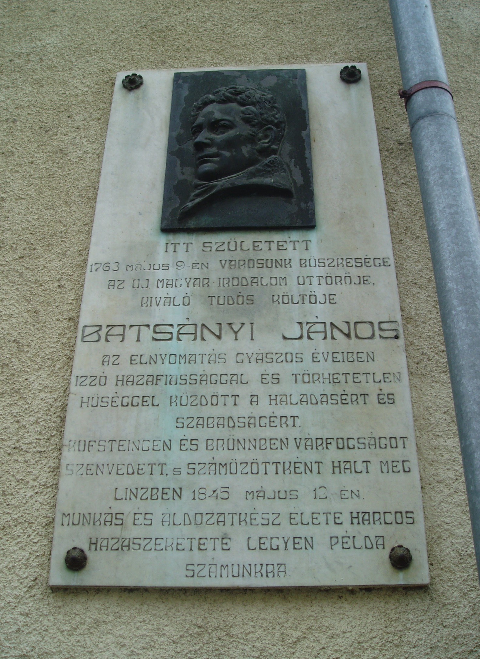 Nyilvános 1443 | 2147 | Tapolca, Batsányi János utca 12. | A mostani ház helyén állt Batsányi János költő szülőháza. Az emléktáblát 1931-ben állították. Itt született a felvilágosodás neves költője 1763. május 9-én. Iskolai tanulmányit Tapolcán kezdte (lásd: Tapolca, Templom domb 8.), majd Keszthelyen, Veszprémben (lásd: Veszprém, Vár utca 8.) és Pesten folytatta. Kassán Kazinczy Ferenccel és Baróti Szabó Dáviddal kezdte szerkeszteni a Magyar Museum című folyóiratot. Ebben jelent meg 1789-ben híres verse, "A franciaországi változásokra", amelyben arra szólít fel, hogy "vigyázó szemetek Párizsra vessétek". Batsányi részt vett a Martinovics-féle összeesküvésében (vádiratát lásd: Tapolca, Templom domb 8.). Egy éves kufsteini várfogság után Bécsben hivatalnokként kereste kenyerét. 1805-ben vette feleségül az osztrák költőnőt, Baumberg Gabriellát. 1809-ben lefordította és kiegészítette Napóleon magyarokhoz intézett proklamációját. A Bécsből kivonuló francia csapatokkal Párizsba ment, ahol 1815-ben a Párizst megszálló osztrák katonaság elfogta. Spielberg várbörtönéből felesége közbenjárására kiszabadult, de Linzbe száműzték, ahova felesége is követte. Ott hunyt el 1845-ben. Hamvait - felesége hamvaival együtt - 1934-ben hazaszállították Tapolcára. Sírjuk az ún. Régi köztemetőben található, eredeti síremléküket a múzeumban (Templom domb 8.) helyezték el. A felvétel 2007 februárjában készült. Felh. irod.: Látnivalók Veszprém megyében. Miskolc, Well-PRess, 2000 Hangodi László: Múltbanéző - kiállításvezető a Tapolcai Városi Múzeum tárlataihoz. Tapolca, 2006 |