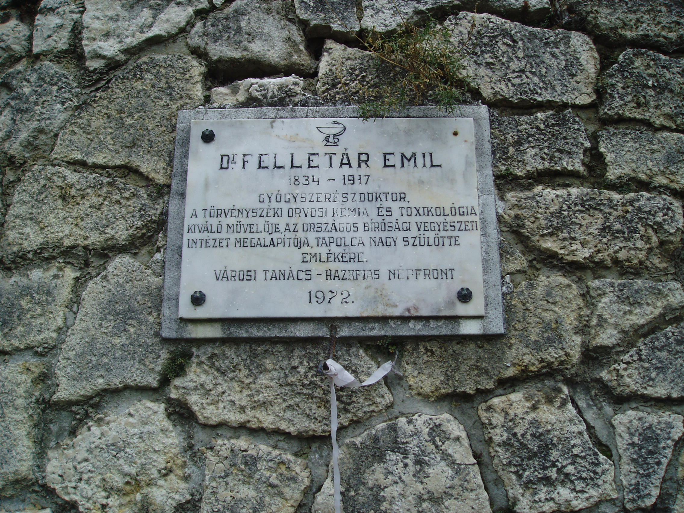 Nyilvános 1397 | 2123 | Tapolca, Városi Panteonfal: Felletár Emil emléktáblája | A Malom–tó mögött álló magas kőfal a Városi Panteonfal, amelyen több neves, tapolcai kötődésű személyiségnek állítottak emléktáblát. Dr. Felletár Emil (1834-1917) gyógyszerész-doktor, a törvényszéki orvosi kémia és toxikológia kiváló művelője tapolcai születésű volt. Emléktábláját 1972-ben avatták fel. A felvétel 2007 februárjában készült. Felh. irod.: Bándi László: Emlékhelyek Veszprém megyében. Veszprém, 1996 www.tapolca.hu |