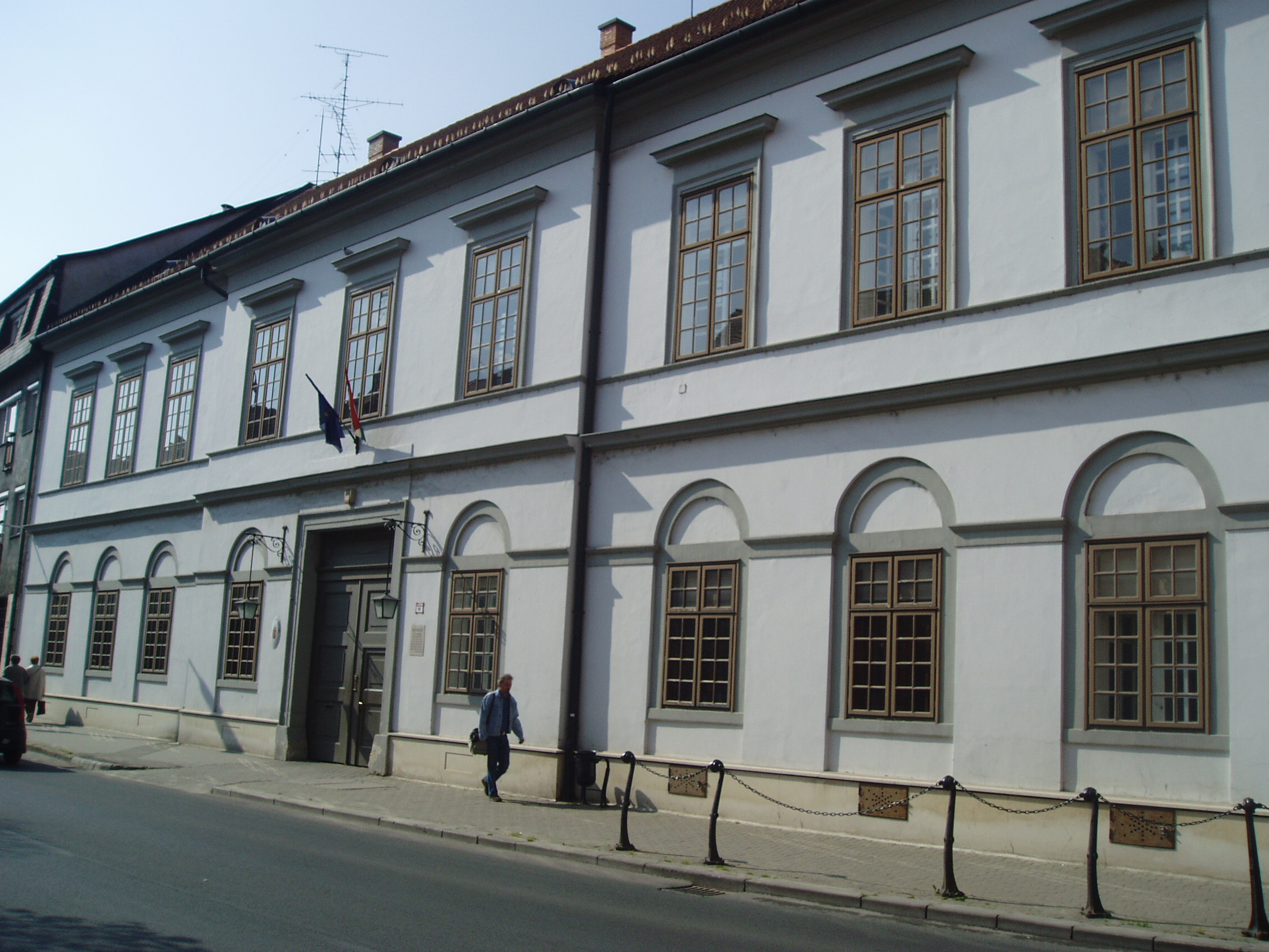 Nyilvános 1424 | 2248 | Pápa, Fő utca 17. Régi Megyeháza | A két utcára néző egyemeletes középületet 1824-ben építették klasszicista stílusban. 1732-ig Veszprém vármegyének nem volt hivatalos központja, s a megyegyűléseket elsősorban Pápán és Veszprémben tartották. 1732-ben Veszprémben felépítették a megyeházát a püspök által ajándékozott telken. Pápa azonban, ragaszkodván ősi jogaihoz, 1824-ben szintén épített egy megyeházát. Az épülethez jeles irodalmi emlék is fűződik: a pápai kollégium (lásd: Pápa, Petőfi u. 13.) önképzőköre 1842. június 30-án itt tartotta egyik ünnepi összejövetelét, amelyen részt vett Petőfi Sándor és Jókai Mór is. Petőfi - akkor még Petrovics Sándor az 1841/42-es tanévben a pápai református kollégium diákja volt. Szorosan vett iskolai tanulmányai mellett pályájára döntő hatással volt az iskola önképzőkörének - Képzőtársaságának - tevékenysége, amelyben az ugyancsak Pápán diákoskodó Jókaival, Orlai Petrich Somával és más jeles diákokkal vett részt. Az 1842. június 30-i ünnepségen az arra érdemesített diákok saját verseikkel, elbeszéléseikkel, szavalatokkal mutatkoztak be a város közönségének. Eszterházy Károly, Pápa ura pénzjutalmat is kitűzött a legjobb teljesítmények jutalmazására. Ez alkalommal Petőfi két verse is elhangzott diáktársai tolmácsolásában: Lehel című balladája, illetve a Szín és való (lásd még: Pápa, Fő tér 15.) című verse. Ő maga viszont más költőktől szavalt (akkoriban még színész szeretett volna lenni). Különösen nagy sikert aratott egy korabeli divatos verssel, Szalkay Máté: Ólmos botok című költeményével. Kölcsönkért jelmezben - lobogós ingben, pitykés nadrágban, kezében fütyköst forgatva - remekül eljátszotta a maradi korteseket parodizáló verset. Lehel című balladájával két arany pályadíjat nyert, s a jelen lévő Eszterházy grófnak annyira tetszett az Ólmos botok előadása, hogy jutalmát megtoldotta még egy arannyal. A műsoron Jókai is jelen volt, neki két elbeszéléséből olvastak fel diáktársai részleteket. A fénykép 2007 áprilisában készült. Felh. irod.: Németh Adél - Szabó Lajos: Pápa. Bp. Panoráma, 1989 "A kényes úrfi s a rongyos baka". Tanulmányok két halhatatlan pápai diákról. Pápa, Pápai Református Gyűjtemények, 2001 |
