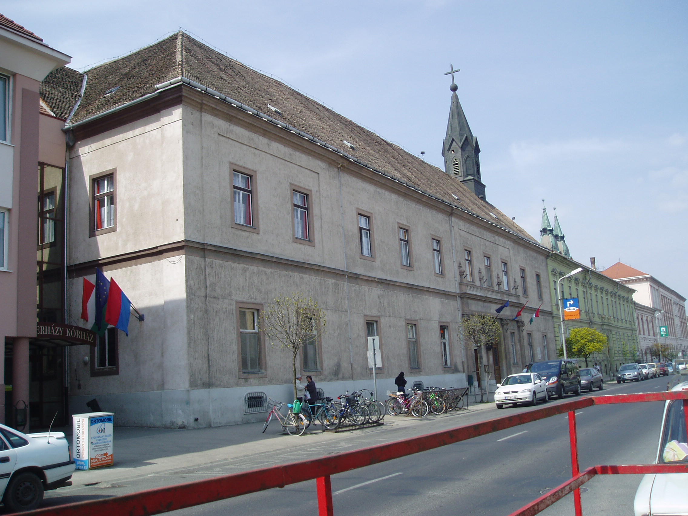 Nyilvános 1413 | 1907 | Pápa, Jókai utca 7. | A kórház régi épülete 1763-1768 között készült el Fellner Jakab tervei alapján. Az irgalmas rendet 1730 körül gróf Esterházy Ferenc telepítette le Pápán az akkor gyakori pestises betegek ápolására. Első kórházuk is ezen a helyen volt, melynek céljára a Zöldfa vendéglőt alakították át. A mai kórházat 1757-ben alapította Eszterházy Károly, Pápa ura, akkor váci, majd egri püspök (lásd még: Pápa, Jókai u. 9.). A Fellner Jakab által épített, azóta kibővített és átalakított épület egyemeletes, szárnyai négyszögű udvart vesznek körül. A ma is látható torony az egykori kórházkápolnához tartozott. A főbejárattól balra található az 1757-ben alapított patika, amely ma múzeum, illetve magángyógyszertárként ma is működik. Belső terét csehsüvegboltozat fedi. Az ajtót keretező provinciális jellegű festmények 1782-ben készültek. Védetté nyilvánított berendezése művészi értéket képvisel. A fénykép 2007 áprilisában készült. Felh. irod.: Németh Adél - Szabó Lajos: Pápa. Bp. Panoráma, 1989 |