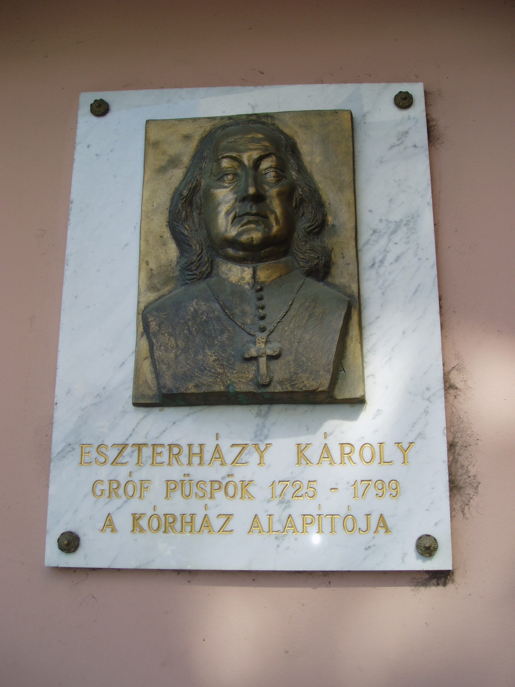 Nyilvános 1486 | 2229 | Pápa, Jókai utca 9. | A kórház közelmúltban átadott új épületén - a régi épület szomszédságában - gróf Eszterházy Károly (1725-1799) portrédomborműves emléktáblája látható. Pápán a kórházi ápolás bevezetése az Esterházy Ferenc által 1730 körül betelepített Irgalmas rend nevéhez fűződik. Pápa városi kórházát 1757-ben alapította Esterházy Károly - akkor váci, majd egri püspök -, Pápa ura. A szomszédos épület (lásd: Pápa, Jókai u. 7.) az ő adományából épült Fellner Jakab vezetésével. A fénykép 2007 áprilisában készült. Felh. irod.: Németh Adél - Szabó Lajos: Pápa. Bp. Panoráma, 1989 Veszprém megyei életrajzi lexikon. Veszprém, Veszprém Megyei Önkormányzat Közgyűlése, 1998 |