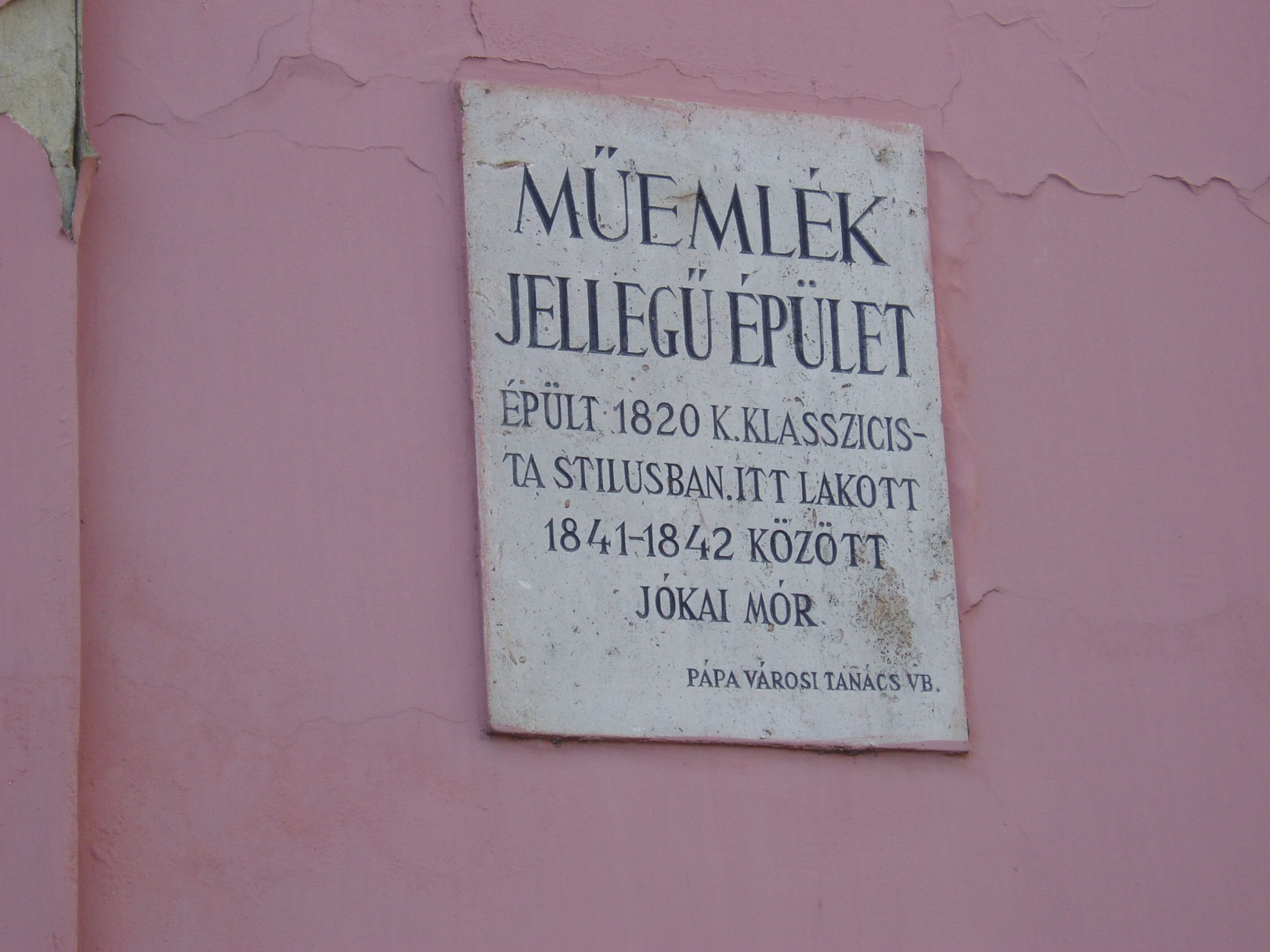 Nyilvános 1417 | 1995 | Pápa, Jókai utca 13. | Klasszicista stílusban, 1820 körül épült egyemeletes lakóház. Homlokzatán emléktábla jelzi, hogy pápai diák korában, 1841/42-ben itt lakott Jókai Mór. Jókai - akkor még Jókay - Mórt sógora, Vály Ferenc hozta Pápára 1841. aug. 21-én különbözeti vizsgát tenni, ami után a fiú a Kollégium (lásd: Pápa, Petőfi u. 13.) diákja lett. Nov. 1-jén költözött be bebbe a házba, Klára Mihály otthonába, kosztosdiákként. (Még idős kori levelében is emlegette a "derék" Klára Mariska főztjét.) Együtt lakott Kerkapoly Károly későbbi filozófiaprofesszorrel és pénzügyminiszterrel és egy Pap Dénes nevű iskolatársával. Az itt töltött időben Jókai jeles előmenetelű diák volt. Tanulmányai mellett portréfestéssel is foglalkozott. Visszavonult, szolíd életet élt, amivel táraitól kiérdemelte a "Jámbor" becenevet. Ebben gyerekkori betegségének, tüdő-problémáinak is része volt. Lakótársain kívül elsősorban Orlai Petrich Somával barátkozott. Petőfivel 1842-ben ismerkedett meg. Eltérő egyéniségük ellenére hamar jóban lettek, sok időt töltött Petőfiék szállásán (lásd: Pápa, Petőfi u. 11.), de igazi barátság csak a későbbi kecskeméti években alakult ki közöttük. Bár még elsősorban festőművésznek készült, de novellákat is írt; az egyikkel második díjat nyert 1842-ben (lásd: Pápa, Fő u. 17.). Itt töltött időszaka, a diákélet szokásai, jeles professzorai nagy hatást gyakoroltak életművére. Különösen sok pápai motívum lelhető fel az És mégis mozog a föld és az Egetvívó asszonyszív című regényeiben. A házat még Jókai életében, 1880-ban jelölték meg emléktáblával (lásd: Pápa, Jókai u. 13. 3.kép). A fénykép 2007 áprilisában készült. Felh. irod.: Németh Adél - Szabó Lajos: Pápa. Bp. Panoráma, 1989 Petőfi emlékhelyek a Kérpát-medencében. Kiskőrös, 1996, Petőfi Sándor Társaság "A kényes úrfi s a rongyos baka". Tanulmányok két halhatatlan pápai diákról. Pápa, 2001, Pápai Református Gyűjtemények |