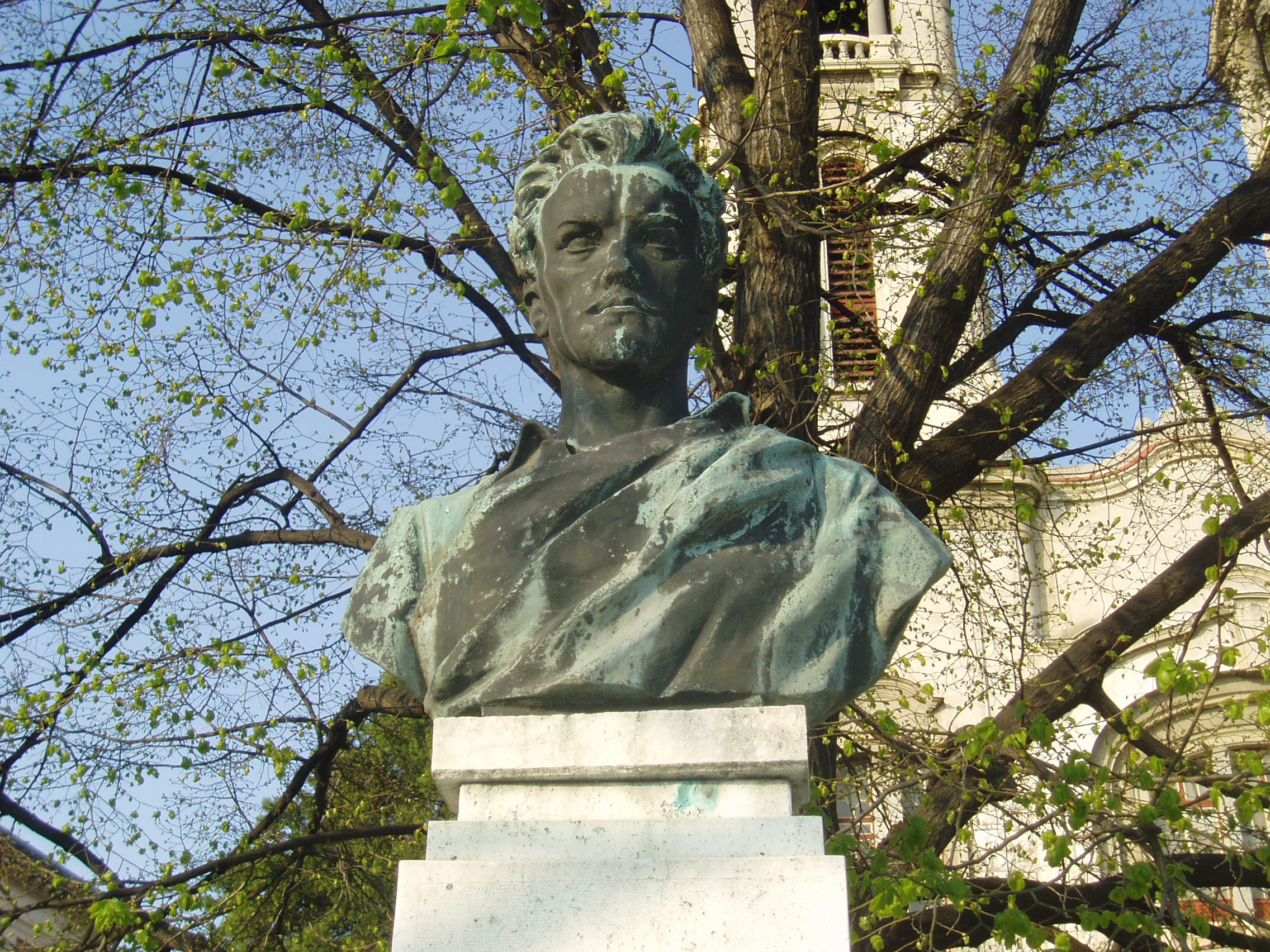 Nyilvános 1505 | 2843 | Pápa, Március 15. tér: Jókai Mór mellszobra | A Honvéd emlékművet (lásd: Pápa, Március 15. tér. Honvéd emlékmű) Petőfi Sándor és Jókai Mór oszlopon nyugvó mellszobra fogja közre. Mindketten a pápai kollégium (lásd: Pápa, Petőfi u. 13.) diákjai voltak 1841/42-ben. A szobrok alkotója Kisfaludy Strobl Zsigmond. Megvalósításukban a pápai Jókai Körnek volt komoly szerepe, felállításukat még 1898-ban kezdeményezték. Végül 1931-ben sikerült csak felavatni őket a református főiskola 400 éves jubielumán, az ünnepségen részt vevő Horthy Miklós kormányzó jelenlétében. Petőfi mellszobrának talapzatán a költő Pápán írt egyik versének idézete olvasható: "A kürtkebelbe fú Lehel s a kürt riadva énekel". A fénykép 2007 áprilisában készült. Felh. irod.: Németh Adél - Szabó József: Pápa. Bp. Panoráma, 1989 |