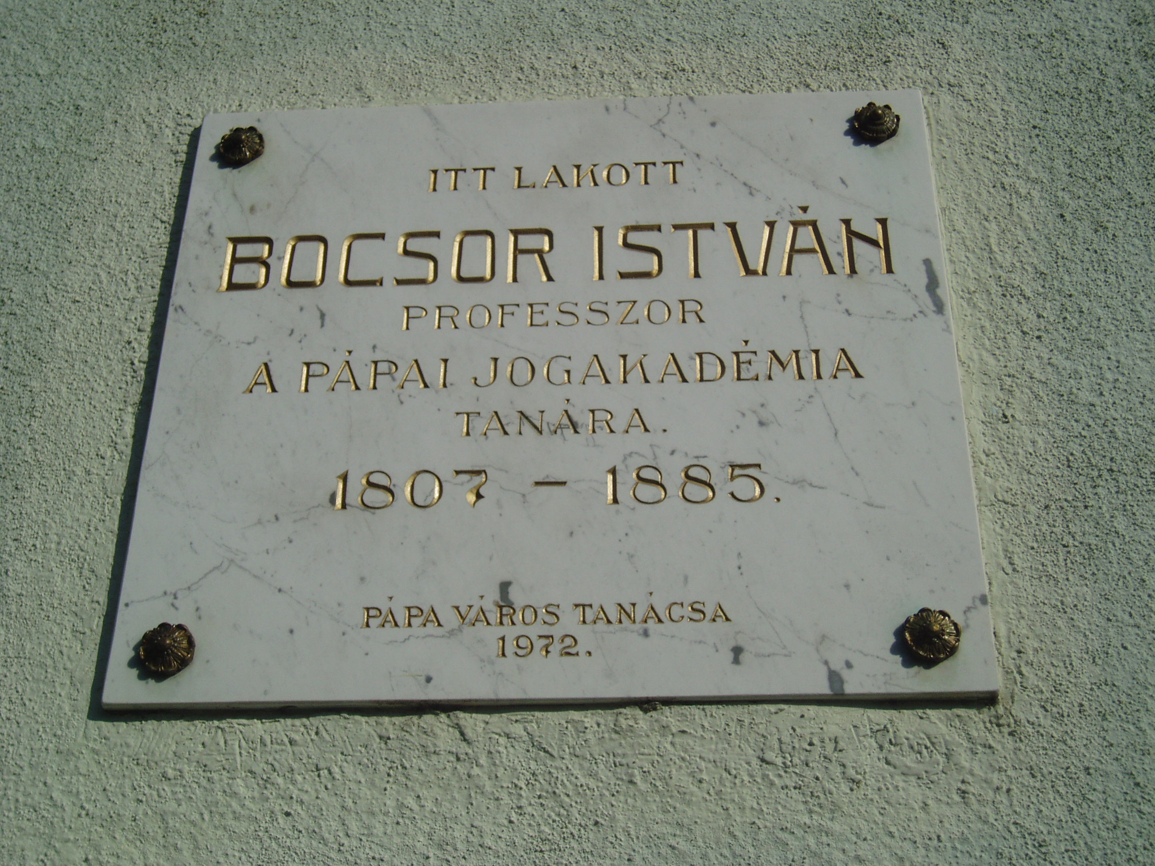 Nyilvános 1526 | 2956 | Pápa, Széchenyi utca 10. | A városi lakóház többszörös kultúrtörténeti jelentőséggel bír. Itt, a ház utcafronti részében lakott Bocsor István (1807-1885), a pápai református kollégium (lásd: Pápa, Petőfi u. 13.) egyik nagy tanáregyénisége. Tanulmányait is abban az iskolában végezte, s 1837-ben lett az intézmény tanára. Magyar nyelvű történelemórái a város közönségére is nagy hatást gyakoroltak. Latin nyelvtana öt kiadást ért meg. 1848-ban az enyingi kerület nemzetgyűlési képviselője volt. A szabadságharc bukása után visszavonultan csak pedagógiai munkásságának élt. Az 1885-ben elhunyt tanár sírja az Alsóvárosi temetőben van (lásd: Pápa, Alsóvárosi temető: Bocsor István sírja). Egykori lakóházán 1972-ben avattak emléktáblát. Alakját a ház másik lakója, a költő Kozma Andor "Karthagói harangok" című versében örökítette meg: A pápai öreg kollégyiom terme Csupa vén diákkal zsúfolásig telve. Ajkuk néma, mint a faragott képnek, Pedig verekedő vad fickók lehetnek.: Több homlokon, arcon beforradt sebhelyek, Kemény hideg-vasra valló emlékjelek; Van, kinek hiányzik fél keze, fél lába... Ilyenek is járnak Pápán iskolába. Ki históriában kutat világeszmét, Tudós Bocsor István professzor tart leckét. Tavaly Debrecenben még Enyéng követje, Alig egy fél éve még tömlöcre vetve, Most Bécs kegyelméből, rendőrtől figyelve, Megint katedráján a hatalmas elme. Tilalmas részére a honi történet, Hanem Kárthágórul s Rómárul beszélhet. Im beszél is bőven ékesszavú ajka, Visszatért diákok szomjan csüggnek rajta. ..."S a dicső Kárthágó, mondja a professzor, Végső viadalra keseredett ekkor. Ezer éves multját üti vala arcul, Hogyha lemond gyáván a rátukmált harcrul. maga dölyfös Róma egyedül ha támad, Nem győz hős haragján Kárthágó hadának. Barbár Masszinissza, gaz numíd szövetség, Ez pecsételé meg Kárthágó elestét. Ám Kárthágó népe a bús végveszélyben Nagyszerű halálra buzdult föl kevélyen. A nemzeti zászlók lobogtak kibontva, Tódultak alájuk, nőtt a had naponta, Kárthágói férfit asszony nem marasztott, Hont védeni mentek urak és parasztok, Kereskedőt üzlet, mesterembert szerszám Nem kötött le többé, - beálltak ezerszám. S a zsönge diákok az iskola padját Fegyverért esengve önként odahagyják... Ó, a boldog ifjak, ép erős legények, Mint irigylik őket rokkantlábú vének! S ezek is elmentek, nem sujthatva mással, Sujtani az ellent bátor, bölcs tanáccsal. ... Mily prelekció ez? Úgy zeng, mint az égbolt... Eszmél a professzor, elhallgat, - elég volt. Hogy is volt? - Kárthágó, harangok és ágyú...? Mily anakronizmus, tudatlan és bárgyú! S mégis: a teremben nem mosolyog senki, Csönd van...tüzes arcok...s könnyezik mindenki. Nem szól a professzor; ha még szólna: torkán Kitörne, mely fojtja, a zokogás-orkán. Ül sokáig némán, sóhajt keserveset: "S Kárthágó - elesett." A fénykép 2007 áprilisában készült. Felh. irod.: "A kényes úrfi s a rongyos baka". Tanulmányok két halhatatlan pápai diákról. Pápa, 2001, Pápai Református Gyűjtemények |