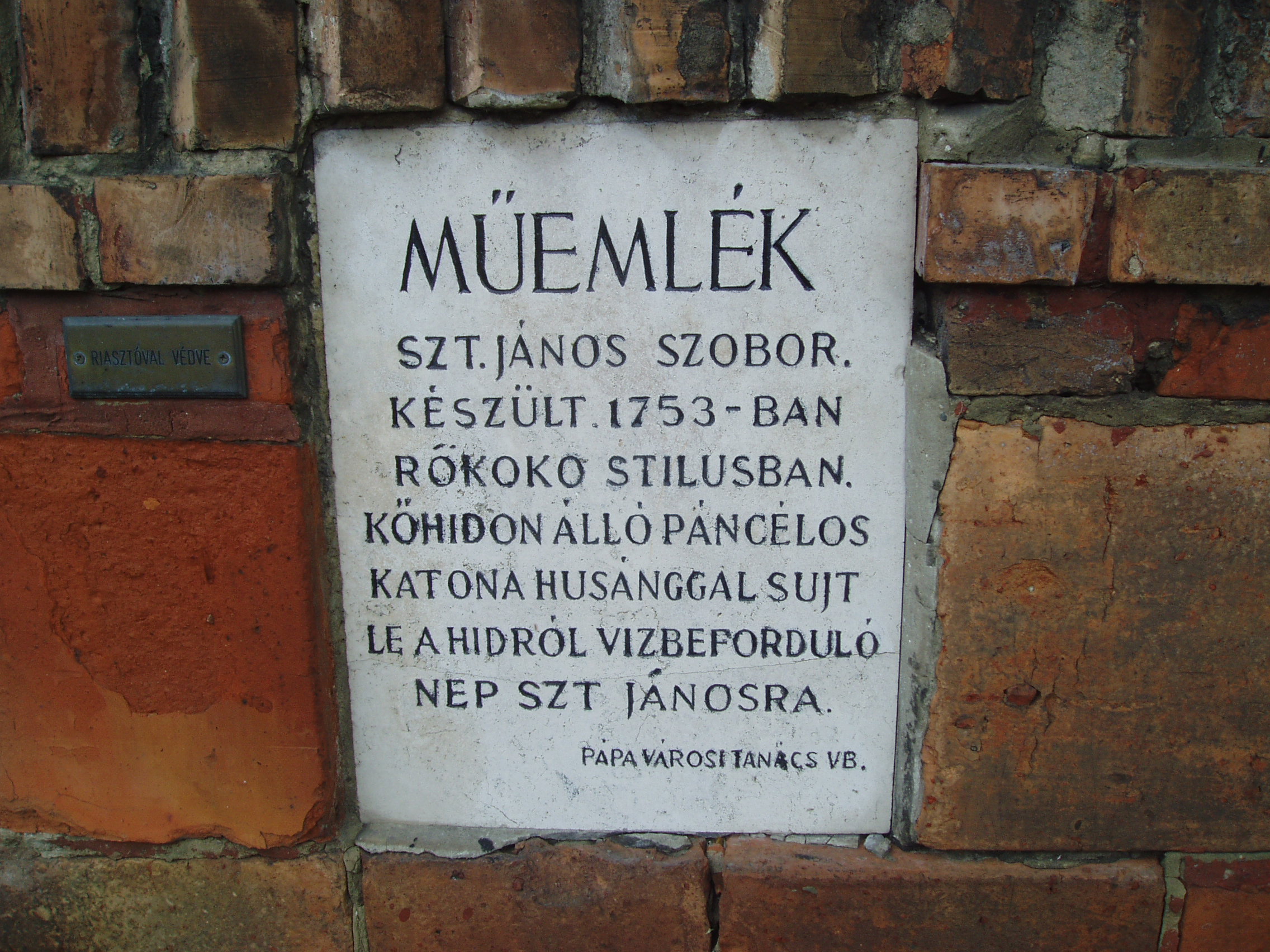Nyilvános 1456 | 2104 | Pápa, Szent István út: Nepomuki Szent János szobra | A Várkertet határoló alacsony téglafal kerítés oldalában, az egykori vámházzal szemben áll a Nepomuki Szent Jánost ábrázoló rokokó stílusú kőszobor. 1755-ben készült, az akkori földesúr, Esterházy Károly faragtatta. Készítője azonos a Flórián szoboréval (lásd: Pápa, Flórián u.). Az átlagostól eltérően komponált szoborcsoport az Esterházy-címerrel díszített magas talapzaton áll. A talapzaton emelkedő kőhíd tövében puttók ülnek. A kőhídon álló páncélos katona husánggal sújt le a hídról a vízbe forduló Szent Jánosra. Nepomuki Szent János (csehül: Svatý Jan Nepomucký; Nepomuk /Csehország/, 1340 és 1350 között – Prága, 1393. március 20.) keresztény vértanú, Csehország védőszentje. Miután pappá szentelték, nemsokára prágai kanonok és érseki helyettes lett. IV. Vencel cseh király őt választotta gyóntatójául. Vencel gyanakodott feleségére és azt követelte Jánostól, hogy árulja el, mit gyónt a királyné. János a gyónási titok szentségére hivatkozva megtagadta a király kívánságát. A király azt is nehezményezte, hogy egy apátválasztást az ő tudta nélkül, mint érseki helyettes megerősített. Mindezért elfogatta, megkínoztatta és a Moldva folyóba dobatta Jánost. 1729-ben XIII. Benedek pápa avatta szentté. A fénykép 2007 áprilisában készült. Felh. irod.: Németh Adél - Szabó Lajos: Pápa. Bp. Panoráma, 1989 www.wikipedia.org |