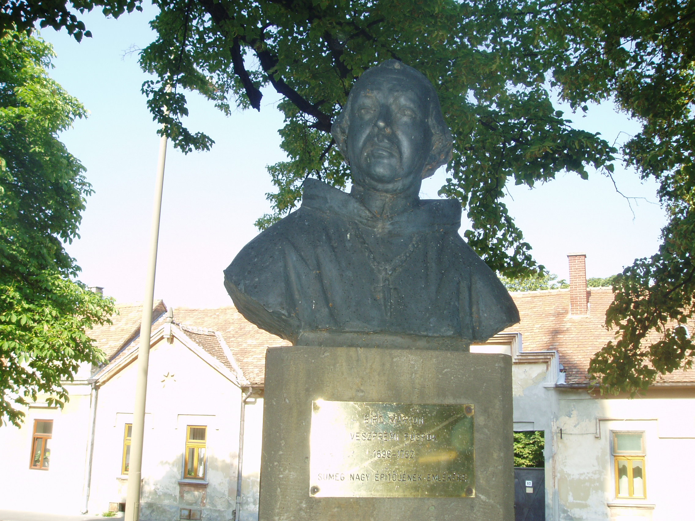 Nyilvános 1437 | 1989 | Sümeg, Bíró Márton utca 1. Plébániatemplom | Sümeg egyik legszebb épülete az Urunk mennybemenetele tiszteletére emelt római katolikus templom. Ezen a helyen már a XIV. században templom állott, melyet Padányi Bíró Márton lebontatott, és 1756-1759 között építtette fel a mai barokk plébániatemplomot. Építészetileg a barokk stílus általános, megszokott mintáit mutatja: nyugati főhomlokzatát hatalmas falpillérek díszítik, fölötte háromrészes főpárkány húzódik, a középrészben az építtető püspök címerével. Az épület igazi értékét Franz Anton Maulbertsch falfestményei jelentik, amelyek az egész templombelsőt beborítják. Nem véletlenül nevezik a templomot a rokokó Sixtus-kápolnájának. A templom előtti kis parkban állították fel az építtető püspök és a festőművész mellszobrait, mindkettő Marton László alkotása. A képen Padányi Bíró Márton püspök (1696-1762) szobra látható. A fénykép 2007 júniusában készült. Felh. irod.: Koppány Tibor - Kozák Károly: Sümeg útikalauz. Veszprém, Idegenforgalmi Hivatal, 1965 Látnivalók Veszprém megyében. Miskolc, Well-PRess, 2004 Sümegi kalauz. Sümeg, Sümegi Fórum Alapítvány, 1993 |