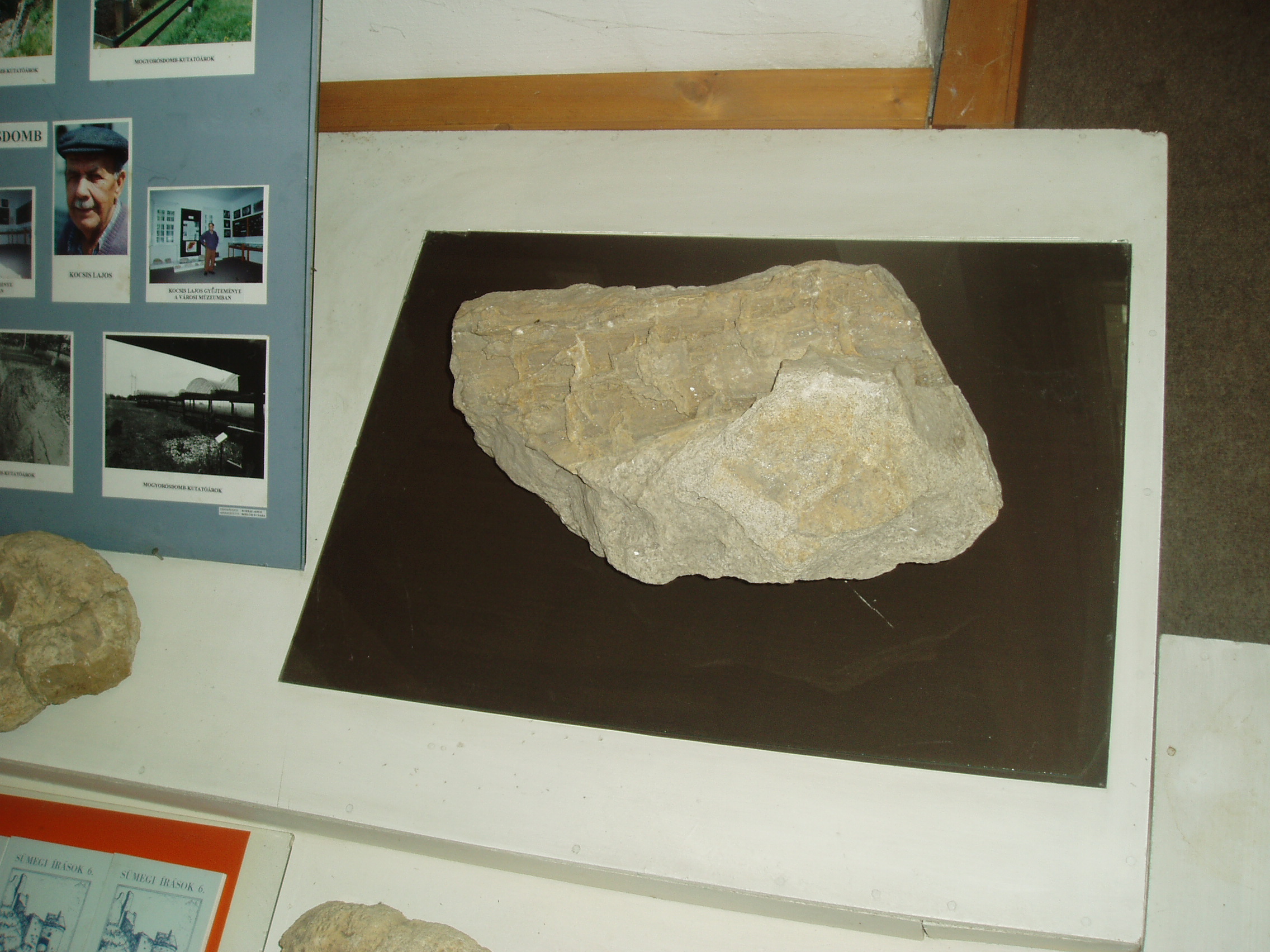 Nyilvános 1367 | 1851 | Sümeg, Kisfaludy tér 2. Városi Múzeum | A Kisfaludy Sándor szülőházában lévő múzeum külön teremben mutatja be Kocsis Lajos geológiai gyűjteményét. Kocsis Lajos nyugdíjas bányász, aki hosszú évtizedeken keresztül lelkesen gyűjtötte a Bakony geológiai múltját őrző kövületeket. Magángyűjteményéből 1984-ben nyílt állandó kiállítás. Az egykori élet nyomai mellett a velük egyidőben képződött, iparilag jelentős ásványi nyersanyagok mintapéldányai is láthatók itt: bauxit, barnaszén, mangánérc. A múzeum tulajdonába jutott gyűjtemény közel 4000 tételt számlál. A fénykép 2007 júniusában készült. Felh. irod.: Sümegi kalauz. Sümeg, Sümegi Fórum Alapítvány, 1993 |