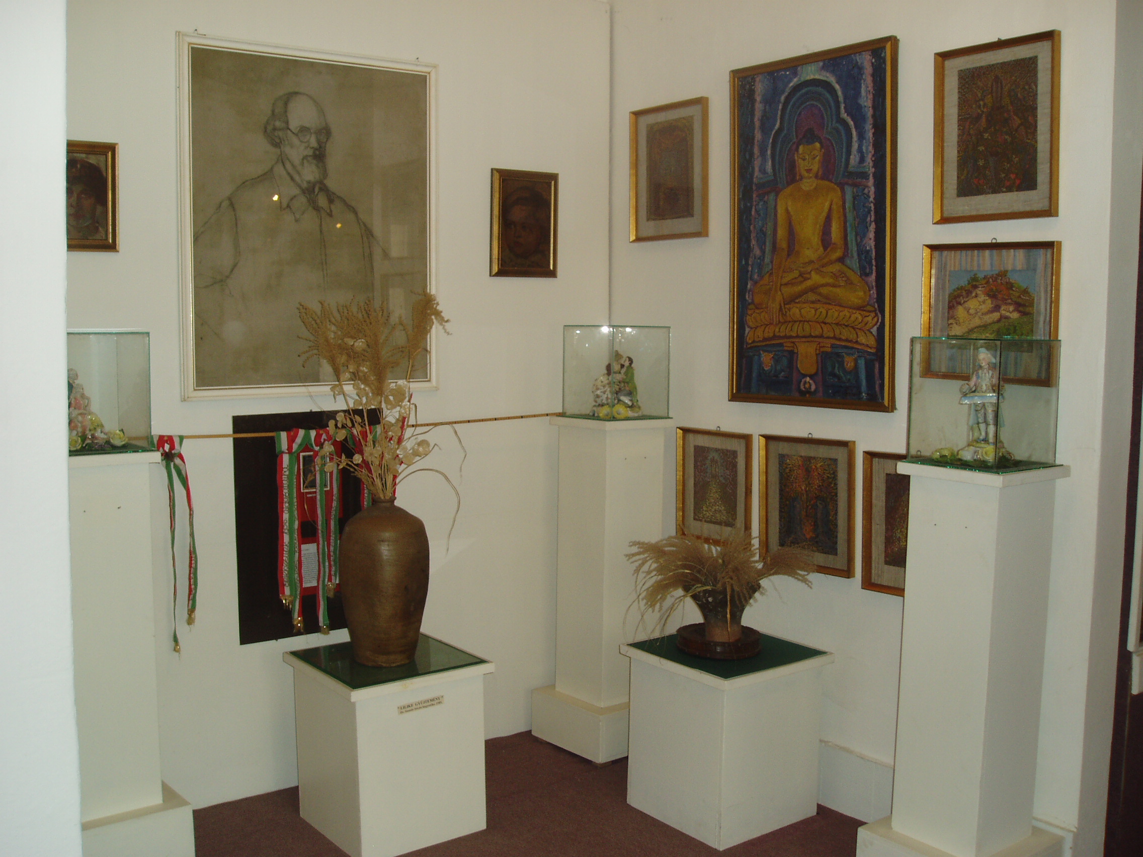 Nyilvános 1421 | 2013 | Sümeg, Kisfaludy tér 2. Városi Múzeum, Sass Brunner-emlékszoba | A Városi Múzeum ad otthont a Sass Brunner emlékkiállításnak is, amely Sass Brunner Ferenc, felesége, Sass Brunner Erzsébet és leányuk, Brunner Erzsébet festészeti munkáit mutatja be. Sass Brunner Ferenc az első világháború után telepedett le Sümegen (lásd még: Sümeg, Szent István tér 3., Sümeg, Temető). Nagykanizsai származású felesége és lánya 1928-ban Indiába utaztak és ott éltek életük végéig. Munkásságuk mára joggal bevonult a XX. század indiai festészetének klasszikusai közé. A kiállítás képanyaga jórészt Elizabeth Brunner adományaként került a múzeum tulajdonába. A művészektől a nagykanizsai Művészetek háza ("kiskastély") is őriz festményeket. A fénykép 2007 júniusában készült. Felh. irod.: Sümegi kalauz. Sümeg, Sümegi Fórum Alapítvány, 1993 |