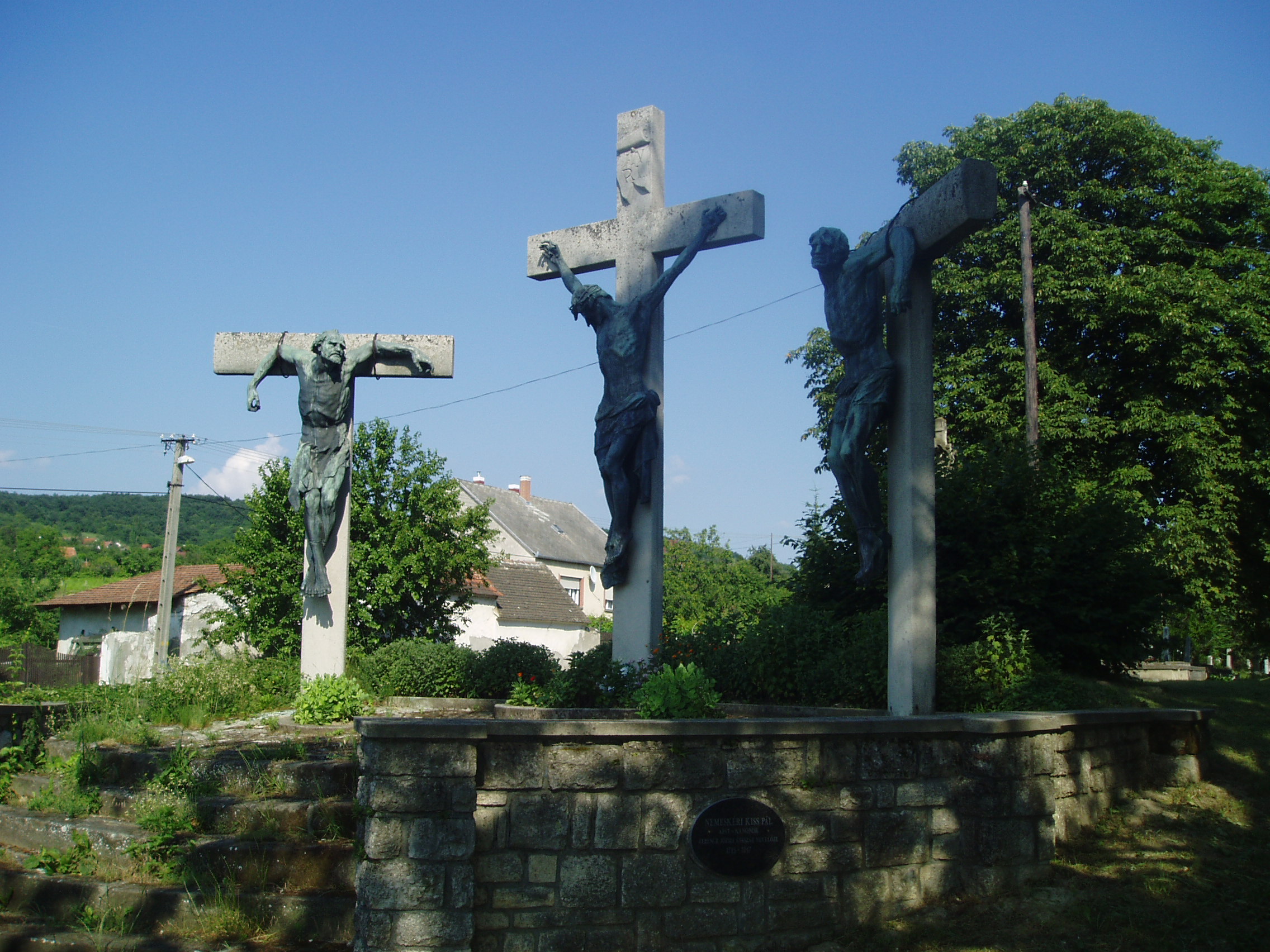 Nyilvános 1417 | 3257 | Sümeg, Temető. Kálvária csoport | Sümeg délkeleti határában, a Tapolcára vezető út mellett emelkedő lankás domboldalon találjuk a város köztemetőjét. Helyét még Bíró Márton püspök jelölte ki; jelentősebb számban a XIX. század eleje óta kezdtek ide temetkezni. A temetődomb tetején áll az 1816-ban épített, későbarokk stílusú temetőkápolna. (Sajnos, nem tudtam lefényképezni, nyáron a körülötte álló fák lombjai szinte teljesen eltakarják - K.K.) Körülötte a sümegi élet utolsó két évszázada szinte valamennyi híres személyiségének sírja fellelhető. A kápolna mellett Siklódy Lőrinc kimagasló művészi értéket képviselő Kálvária szoborcsoportja látható. Az 1926-ban készült, a keresztre feszített Krisztust és a két latort ábrázoló szoborkompozíciót eredetileg Tihanyban állították fel IV. Károly magyar király emlékére. 1960-ban kerültek ide, így sikerült megóvni őket a megsemmisítéstől. A fénykép 2007 júniusában készült. Felh. irod.: Sümegi kalauz. Sümeg, Sümegi Fórum Alapítvány, 1993 Miklósi-Sikes Csaba: Kőbe vésett történelem. A sümegi városi temetők története és sírjelei 1950-ig. Sümeg, Sümegi Fórum Alapítvány, 2002 |