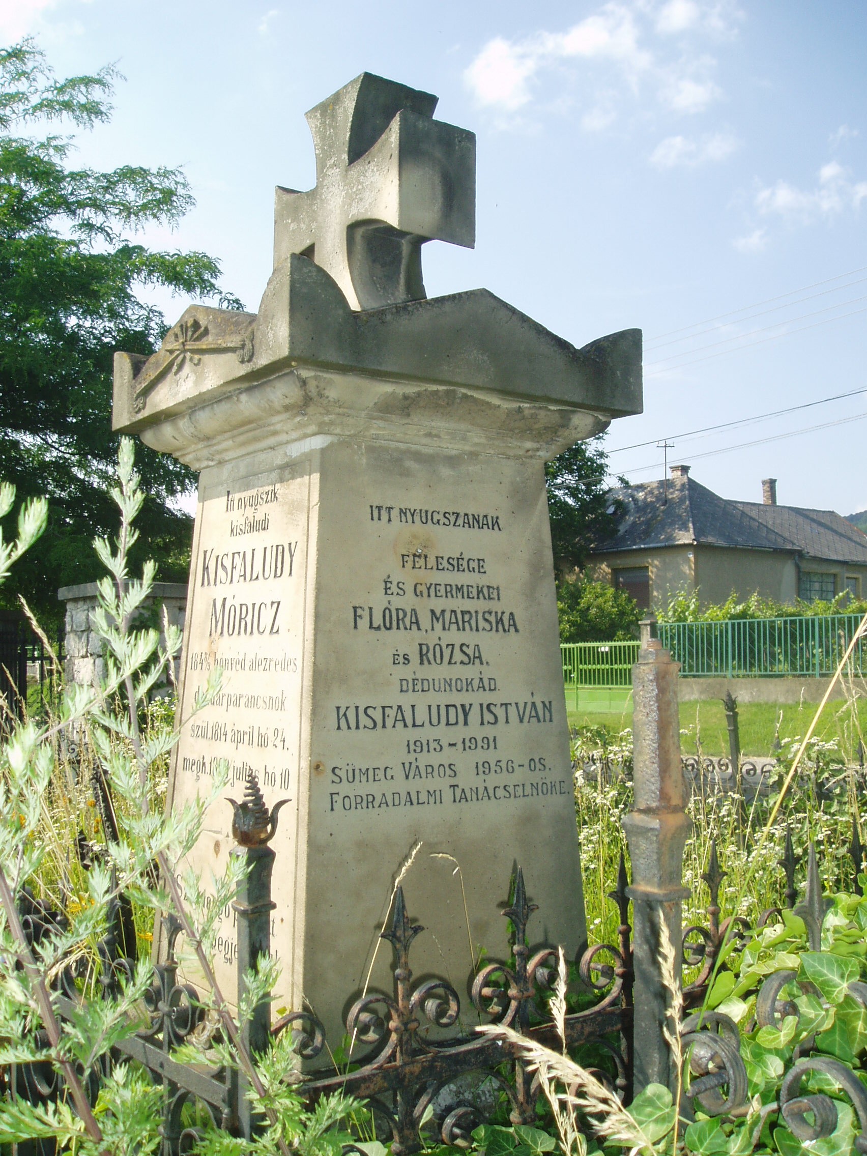 Nyilvános 1420 | 2033 | Sümeg, Temető. Kisfaludy Mór sírja | Sümeg délkeleti határában, a Tapolcára vezető út mellett emelkedő lankás domboldalon találjuk a város köztemetőjét. Helyét még Bíró Márton püspök jelölte ki; jelentősebb számban a XIX. század eleje óta kezdtek ide temetkezni. A temetődomb tetején áll az 1816-ban épített, későbarokk stílusú temetőkápolna. Körülötte a sümegi élet utolsó két évszázada szinte valamennyi híres személyiségének sírja fellelhető. A Tapolcai útra nyíló alsó temetőkapu mellett található Kisfaludy Mór és családja sírkertje. Az empire stílusú sírkő eredetileg Szegedy Róza nyughelyét jelölte. Amikor az 1900-as évek elején egyesítették sírját férjéével, átfaragták sírkövét, s azóta Kisfaludy Mór és családja sírját jelöli. Itt nyugszik Kisfaludy Mór (1814-1893) 1848-as honvéd alezredes, dandárparancsnok, Kisfaludy Sándor unokaöccse. Részt vett az isaszegi, a kápolnai, a pákozdi harcokban, jelen volt Budavár visszafoglalásánál. Aradon halálra ítélték, amit később 16 év várfogságra változtattak. Ismerősei közbenjárására két év múlva kiszabadult, s Sümegre költözött. Véglegesen visszavonult a közélettől, gazdálkodással foglalkozott. Több családtagja is itt van eltemetve. A fénykép 2007 júniusában készült. Felh. irod.: Koppány Tibor - Kozák Károly: Sümeg útikalauz. Veszprém, Idegenforgalmi Hivatal, 1965 Sümegi kalauz. Sümeg, Sümegi Fórum Alapítvány, 1993 Miklósi-Sikes Csaba: Kőbe vésett történelem. A sümegi városi temetők története és sírjelei 1950-ig. Sümeg, Sümegi Fórum Alapítvány, 2002 Veszprém megyei életrajzi lexikon. Veszprém, Veszprém Megyei Önkormányzat Közgyűlése, 1998 |