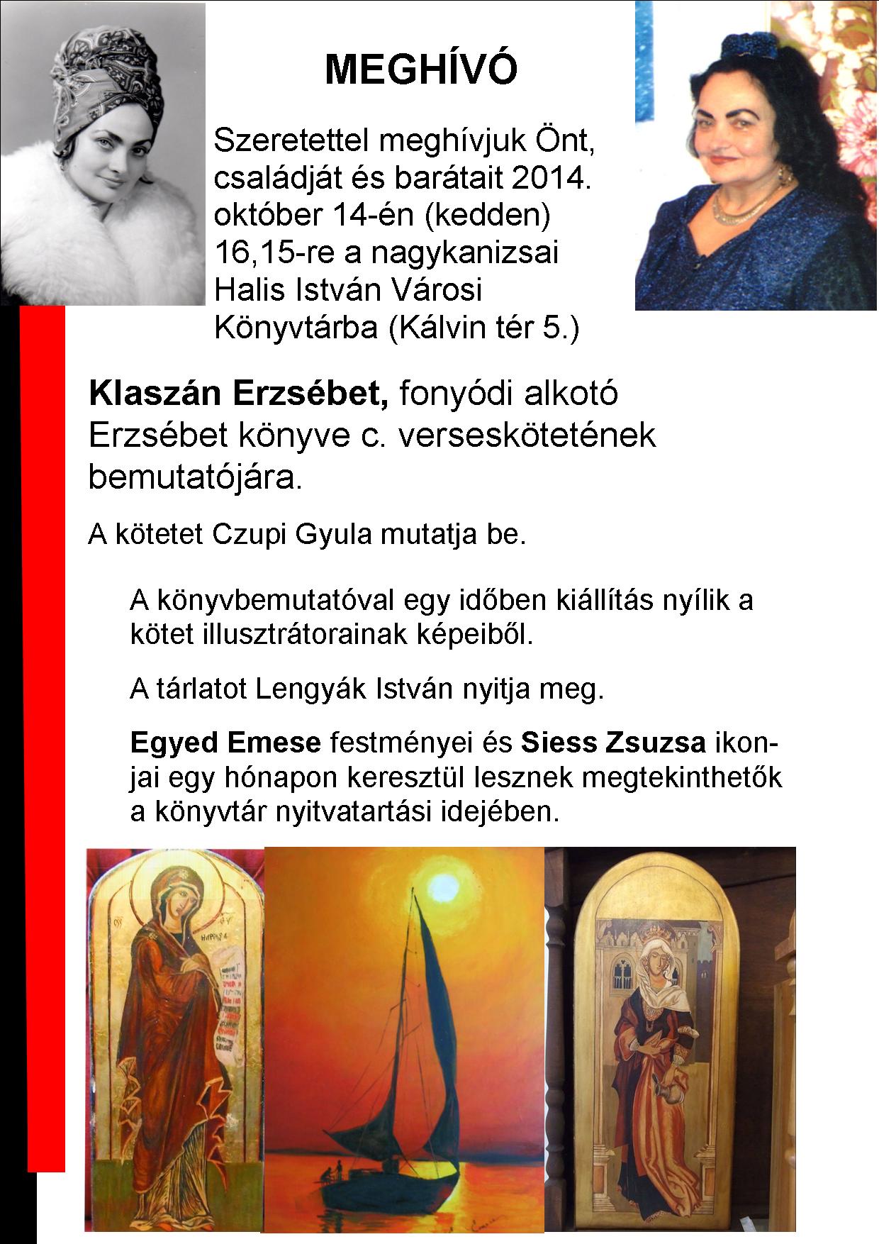 Nyilvános 1550 | 2177 | MEGHÍVÓ | Szeretettel meghívjuk Önt, családját és barátait 2014. október 14-én (kedden) 16,15-re a nagykanizsai Halis István Városi Könyvtárba (Kálvin tér 5.) Klaszán Erzsébet, fonyódi alkotó Erzsébet könyve c. verseskötetének bemutatójára. A kötetet Czupi Gyula mutatja be. A könyvbemutatóval egy időben kiállítás nyílik a kötet illusztrátorainak képeiből. A tárlatot Lengyák István nyitja meg. Egyed Emese festményei és Siess Zsuzsa ikonjai egy hónapon keresztül lesznek megtekinthetők a könyvtár nyitvatartási idejében. |