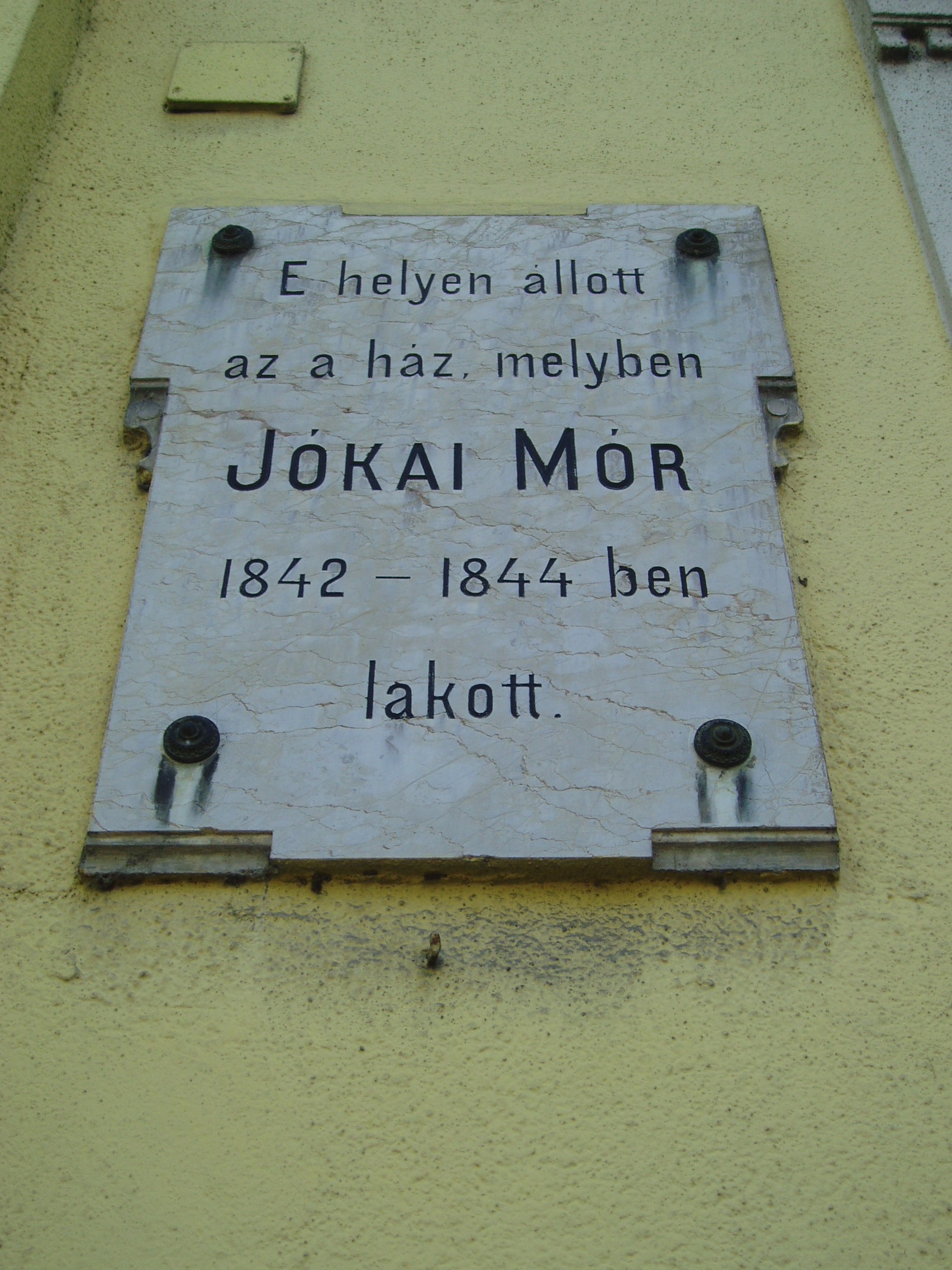 Nyilvános 1544 | 2478 | Kecskemét, Jókai utca 6-8. | Diák korában a korábban ezen a helyen állott épületben, Gyenes Mihályék házában lakott Jókai Mór 1842-44 között. Házigazdája nagy tudású városi mérnök volt, aki az akkor még festőművésznek készülő fiút gyakran magával vitte környékbeli útjaira. Az ekkoriban megismert meg népszokásokat, mint például a pünkösdi király választást vagy a pusztai párbajt később regényeiben is megörökítette. Házigazdájának is köszönhetően írta később: "Itt lett belőlem ember és különösen itt lett belőlem magyar író." Emléktábláját még életében, írói működésének 50. évfordulóján avatták fel. A fénykép 2006 augusztusában készült. Felh. irod.: Heltai Nándor: Kecskemét. Kecskeméti Lapok, 1998 |
