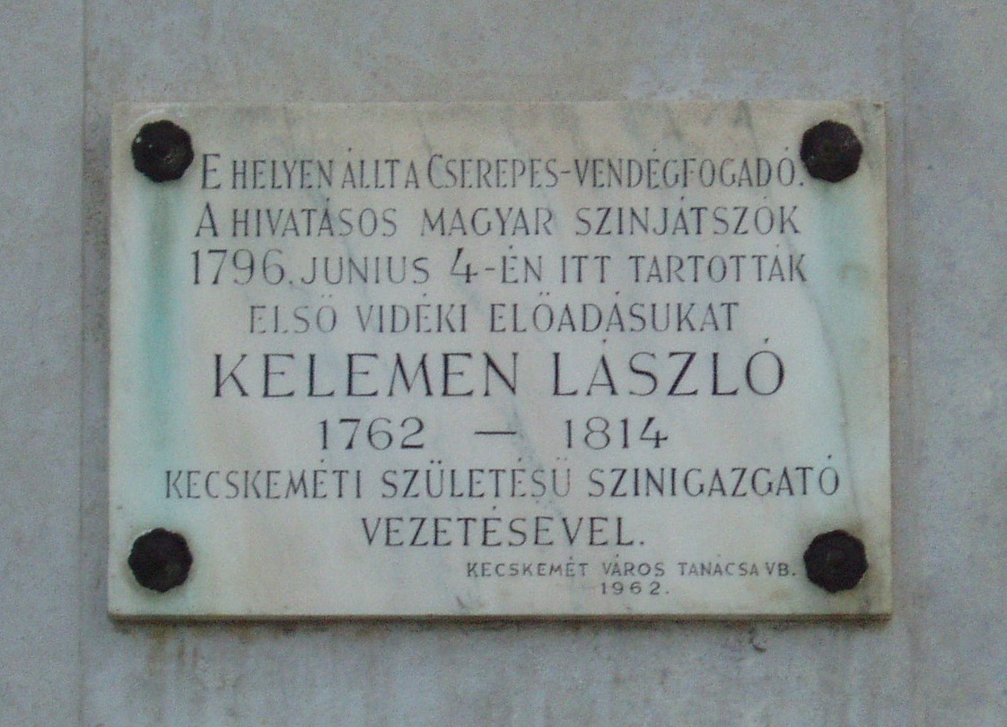 Nyilvános 1529 | 2350 | Kecskemét, Piaristák tere 7. | Az 1950-ben épült kocka alakú, háromszintes SZTK rendelőintézet helyén az 1773–1776 között épített Arany Sas vendégfogadó állott, amelyet a kecskemétiek csak Cserepes néven emlegettek. Udvari fészerében a XVIII. század legvégén alkalmi színpadot alakítottak ki, itt szerepeltek először a városban hivatásos magyar színjátszók, az Első Magyar Játékszíni Társaság. Vezetőjük a kecskeméti születésű Kelemen László volt. Kelemen Lászlóék első kecskeméti előadását Liszka Béla helybeli főreáliskolai tanár keltezte 1796-ra. Újabb vélemények szerint azonban az első hivatásos magyar nyelvű színtársulat csak 1800 nyarán lépett fel Kecskeméten. 1800-ban még Kelemen társulatának tagja volt a szintén kecskeméti születésű és az 1780-as években a piarista gimnáziumban (lásd: Kecskemét, Jókai u. 1.) diákoskodott Szerelemhegyi András, aki színészként és/vagy zenei mindenesként valószínűleg közreműködött a „Cserepes” udvarán megtartott előadásokon. Az Arany Sas fogadóban kecskeméti tanulmányainak megkezdésekor megszállt Jókai Mór, 1857-es országjárása idején pedig Ferenc József és felesége, Erzsébet királyné. Később az épület járásbíróság, majd kórház lett. 1948-ban lebontották s két év múlva emelték helyére a ma is álló épületet. A rendelőintézet Piaristák terére néző falán 1962-ben emléktáblát helyeztek el. A fénykép 2006 augusztusában készült. Felh. irod.: Heltai Nándor: Kecskemét. Kecskeméti Lapok, 1998 Bács-Kiskun megyei történeti és kegyeleti emlékhelyek számbavétele. Kecskemét, 1989. Birck Edit: A Duna–Tisza köze irodalmi országútjain. = Honismeret 2001. 3. |