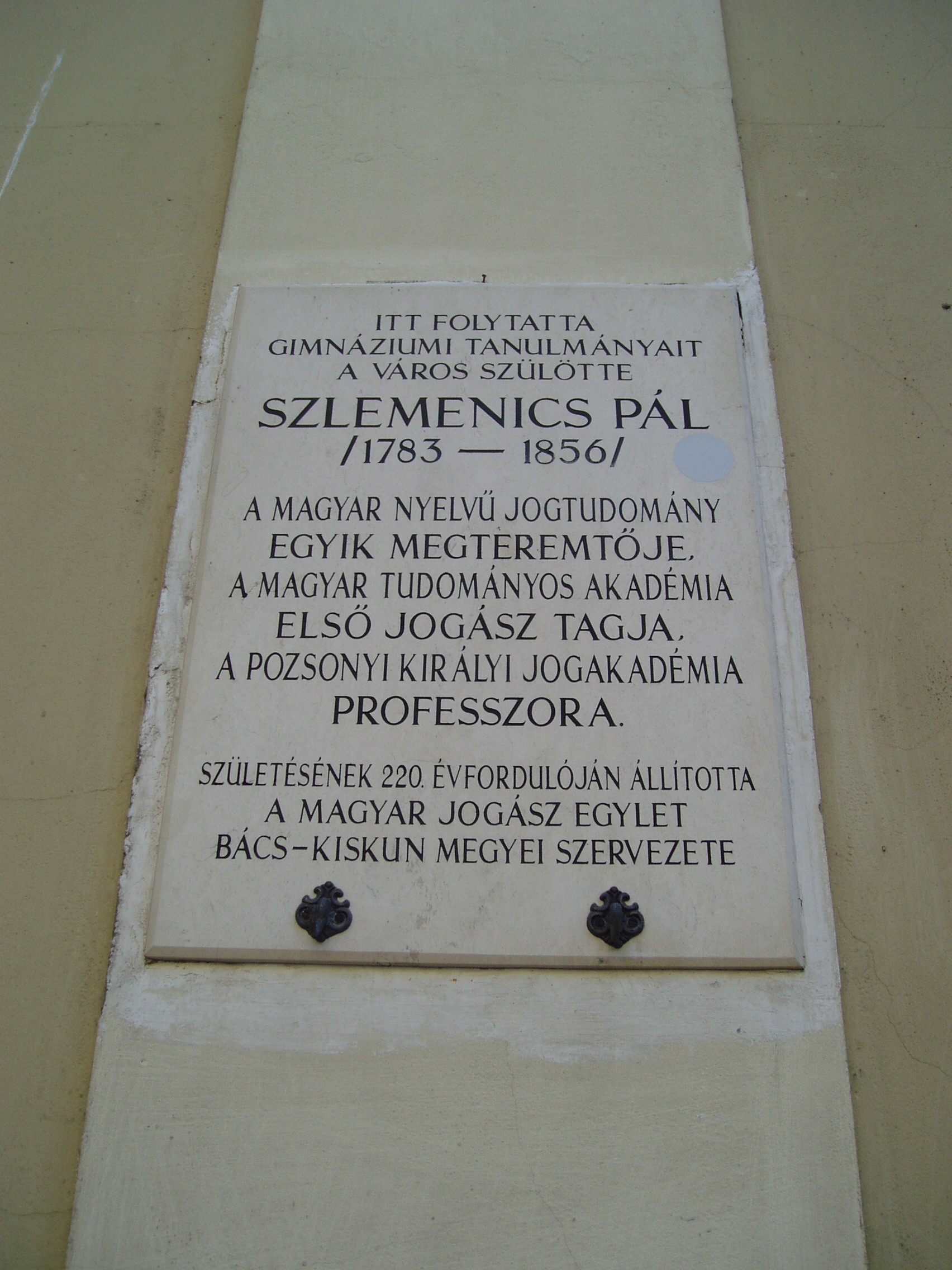 Nyilvános 1516 | 2080 | Kecskemét, Jókai utca 1. Piarista rendház és kollégium | A műemléki védelemmel óvott piarista rendház a mellette álló templommal együtt a város legszebb barokk épületegyüttese. A piarista atyákat a város egyik földesura, gróf Koháry István telepítette le Kecskeméten a XVIII. század elején, s 1712-ben alapítványt is tett templomuk, rendházuk és iskolájuk felépítésére. Az épületegyüttes fokozatosan, több ütemben készült el. A templomot nagy valószínűséggel Mayerhoffer András tervezte. Az oktatást a templom bal oldalán álló, 1720 és 1725 között, Paithmüller József tervei alapján emelt rendház helyiségeiben kezdték el. A jobb oldali iskolai szárnyat 1825–1832 között emelték, majd folyamatosan bővítették az épületet. Tanítás 1933-ig folyt benne. Ide járt iskolába 1804 és 1807 között Katona József, 1813-1815 között Táncsics Mihály, 1833-34-ben Klapka György, később Sík Sándor. Itt tanult az 1780-as években Szerelemhegyi Liebenberger András, a magyar zenés játék megteremtője, karnagy, valamint testvére, Lunkányi (Liebenber) János, Széchenyi István nevelője, műveinek első bírálója. A képen Szlemenics Pál (1783-1856) emléktáblája látható. A magyar nyelvű jogtudomány egyik megteremtője, a Magyar Tudományos Akadémia első jogász tagja, a pozsonyi Királyi Jogakadémia kecskeméti születésű professzora is ide járt gimnáziumba. A fénykép 2006 augusztusában készült. Felh. irod.: Heltai Nándor: Kecskemét. Kecskeméti Lapok, 1998 |