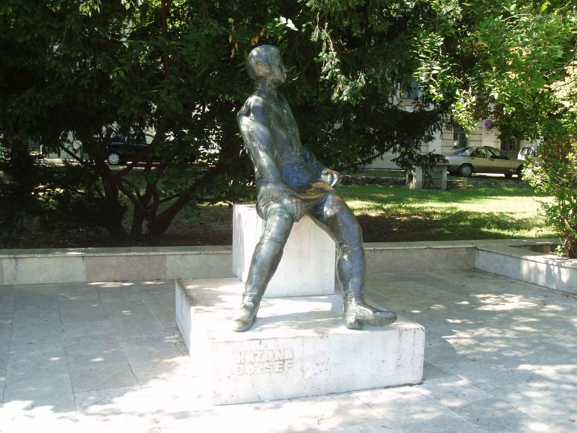 Nyilvános 1408 | 1988 | Kecskemét, Katona József tér 05. Katona József emlékműve | A Katona József Színház mögött 1962. december 16-án Kodály Zoltán avatta fel Vigh Tamás szobrászművész alkotását, Illyés Gyula jelenlétében. Ezen a napon ünnepelte meg szülővárosa Kodály 80. születésnapját, s este a színházban rendezett díszhangversenyen Illyés Gyula maga olvasta fel a Bevezetés egy Kodály-hangversenyhez című versét. A fénykép 2006 augusztusában készült. Felh. irod.: Heltai Nándor: Kecskemét. Kecskeméti Lapok, 1998 Bács-Kiskun megyei történeti és kegyeleti emlékhelyek számbavétele. Kecskemét, 1989 |