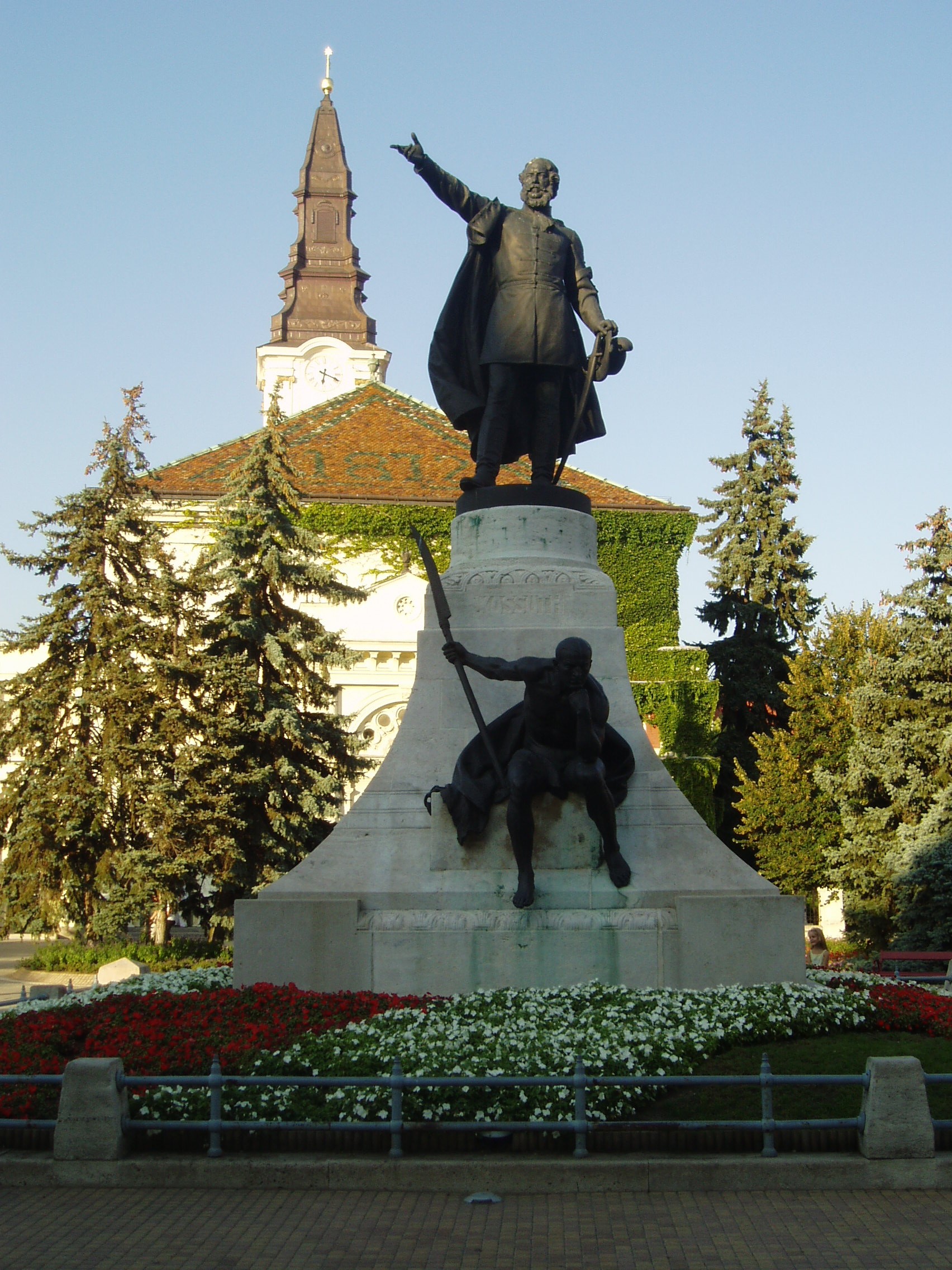 Nyilvános 1485 | 2308 | Kecskemét, Kossuth tér: Kossuth Lajos szobra | Kossuth Lajos 2 és fél méter magas bronzszobrát, Telcs Ede alkotását 1906-ban avatták fel Kecskemét központjában. Az alkotás az 1848/49-es forradalom és szabadságharc emléke mellett Kossuth 1848. szeptember 25-én — ugyanezen a helyen, az akkori régi vásártéren — elmondott toborzó beszédét is felidézi. A szobor ülő mellékalakja kiegyenesített kaszát tart a kezében. E mellékalakról maga a szobrász mondta, hogy ugyan Rodin: Gondolkodó című híres szobrához nagyon hasonló pózban ül, de megfeszített izmokkal, készen rá, hogy ha Kossuth „mégegyszer azt üzeni”, a kezében tartott kiegyenesített kaszával rögtön rámenjen az osztrákra. A helyi hagyomány szerint e mellékalak modellje Kacsóh Pongrác, a János vitéz alapján írt daljáték zeneszerzője volt. A fénykép 2006 augusztusában készült. Felh. irod.: Heltai Nándor: Kecskemét. Kecskeméti Lapok, 1998 Orosz Andrea: Kiskunság és Felső-Bácska. Bp. Frigoria, 2004 |
