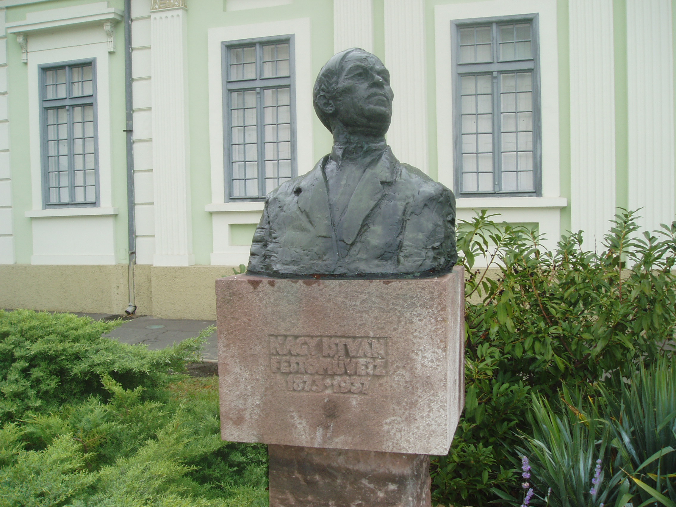 Nyilvános 1852 | 3616 | Baja, Arany János utca 1. | Az egykori Vojnich-kúria 1820 körül épült klasszicista stílusban. 1946 és 1953 között ez az épület adott otthont a Rudnay Gyulának és az általa vezetett művésztelepnek. A kúria ma a Nagy István Baján élt (lásd: Baja, Nagy István u. 8.) festőről elnevezett képtár otthona. Az épület előtti teret Nagy István bronz mellszobra, Varga Imre alkotása díszíti. A fénykép 2007 októberében készült. Felh. irod.: Látnivalók Bács-Kiskun megyében. Miskolc, Well-PRess, 2002 |