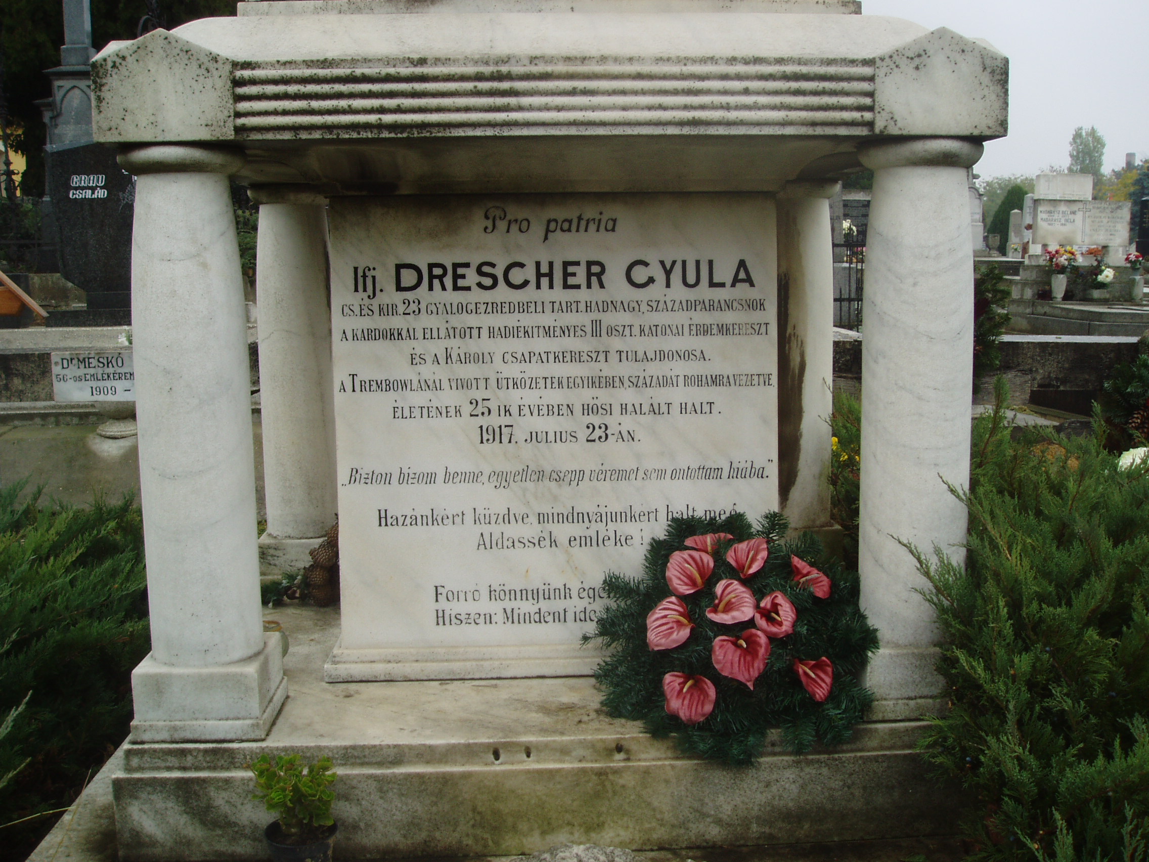 Nyilvános 1466 | 2473 | Baja, Rókus utva: Rókus temető - Drescher Gyula sírja | Itt nyugszik ifj. Drescher Gyula, a 23. gyalogezred tartalékos hadnagya, századparancsnok. Hősi halált halt életének 25. évében, 1917. november 23-án. A fénykép 2007 októberében készült. |