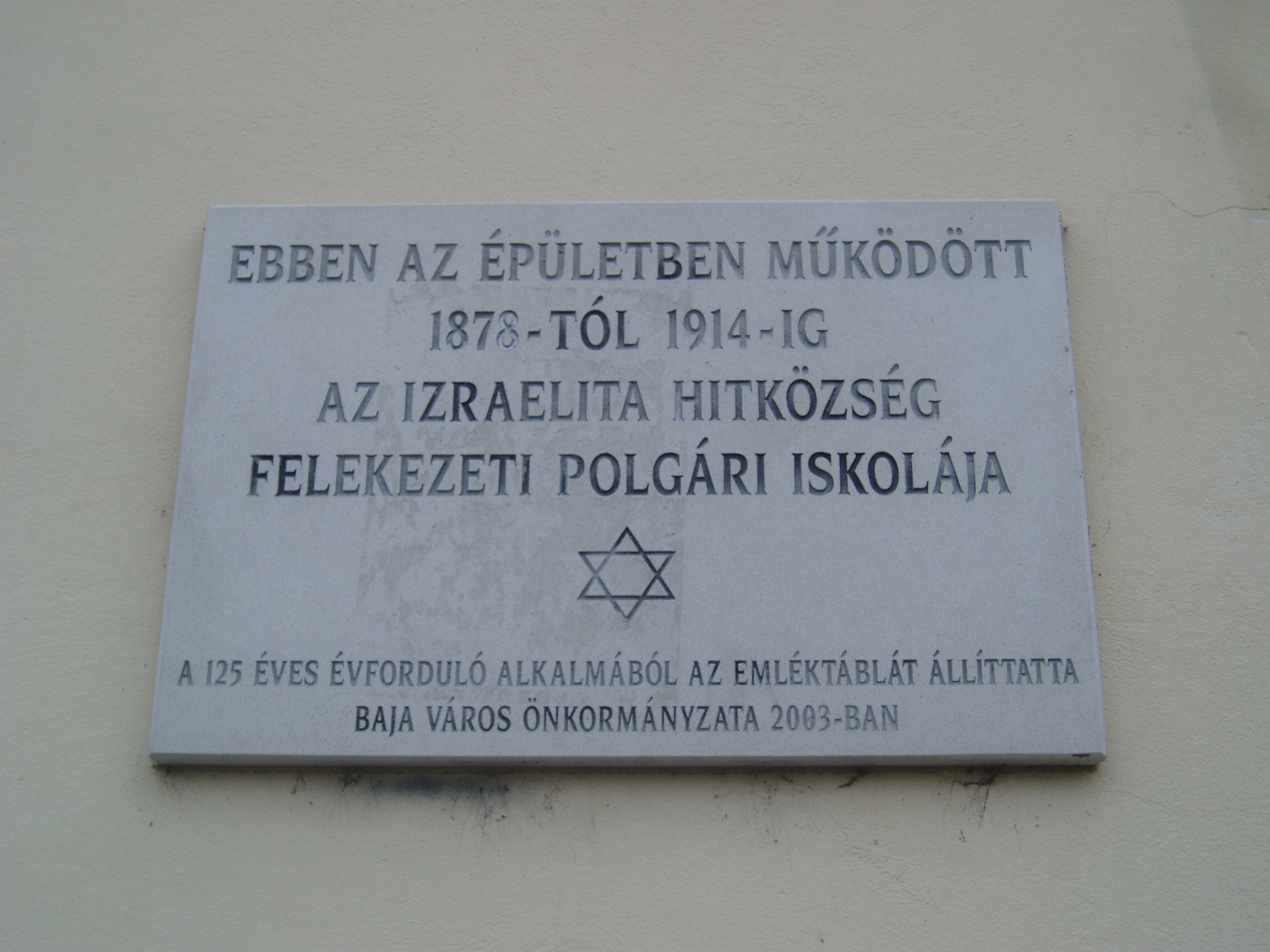 Nyilvános 1485 | 1837 | Baja, Telcs Ede utca 12. | A homlokzaton elhelyezett emléktábla tanúsága szerint ebben, a zsinagóga (lásd: Baja, Munkácsy u. 9.) mellett álló épületben működött 1878és 1914 között az Izraelita Hitközség polgári iskolája. Az épület ma az Ady Endre Városi Könyvtár gyermekrészlegének ad otthont. Bejárata mellett Ady Endre portédomborműve látható. A fénykép 2007 októberében készült. |
