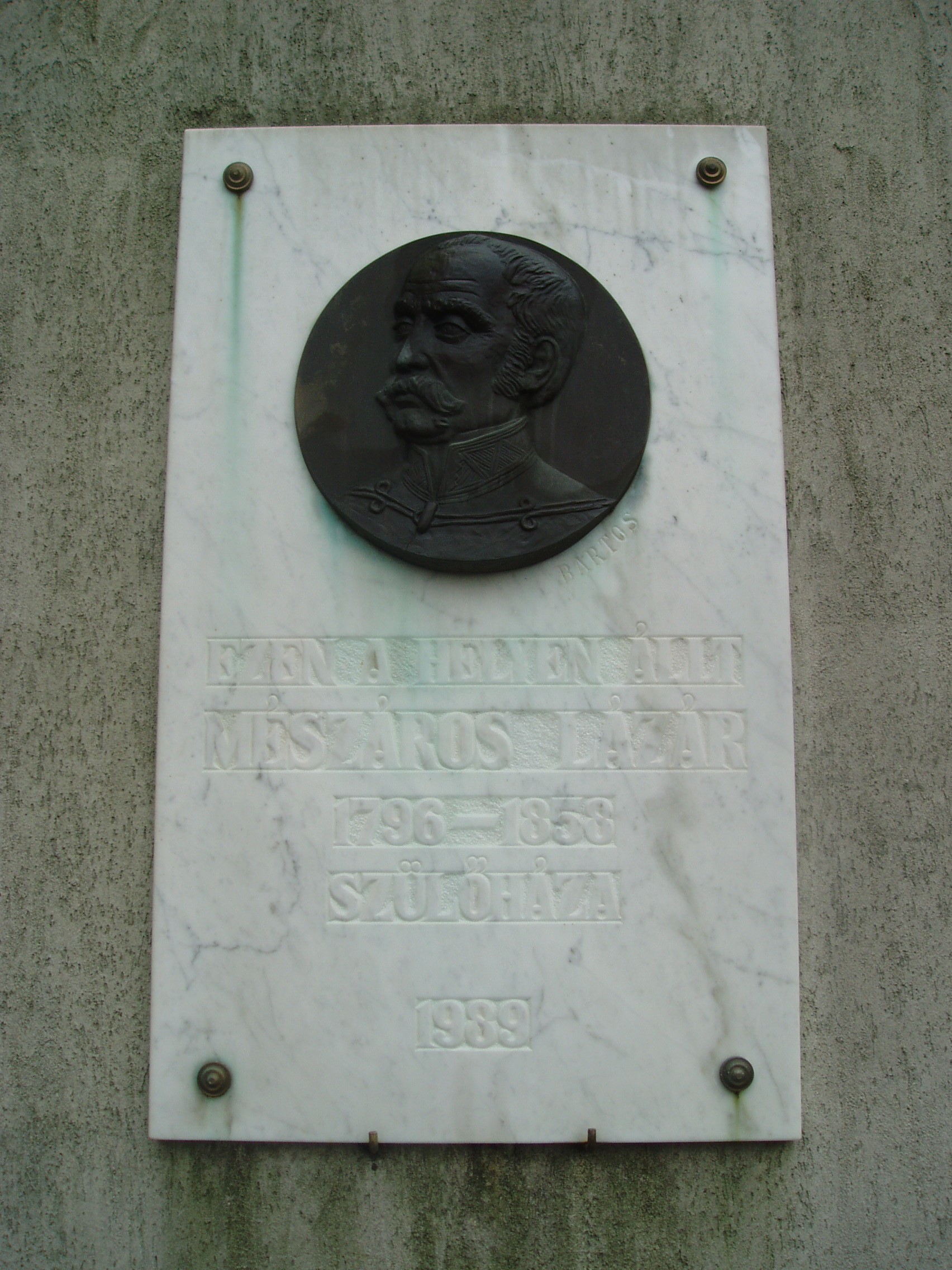Nyilvános 1478 | 1881 | Baja, Vörösmarty utca 6. | A modern lakóház helyén állt egykor Mészáros Lázár, az első magyar hadügyminiszter szülőháza (Kemény Simon 1931-es könyve szerint az épület 1902. nagyszombat délutánján összeomlott). Márvány emléktábláját 1989-ben helyezték el. Mészáros Lázár 1796. február 20-án született Baján. Kicsiny gyermek volt még, amikor nemességet nyert, táblabíró és földbirtokos apja meghalt. Anyja beteges volta miatt a kis Lázár Katymáron nevelkedett nagybátyjánál, az ottani plébánosnál. Négyéves korában már írt és olvasott, „valami csoda kisfiúnak tartották”. Iskoláit Baján, Szabadkán, Pécsett, majd Pesten végezte. Hihetetlen műveltségre tett szert a világi és az egyházi ismeretekben egyaránt. Közben egyre jobban elmélyedt a katonai tudományokban, rendszeresen gyakorolta a fegyverforgatást és a lovaglást. 1813-ban vette kezdetét fényes katonai karrierje. 1845-ben a híres Radetzky-huszárezred ezredparancsnokává nevezték ki. Katonai elfoglaltságai mellett a tudományokkal is behatóan foglalkozott, elsősorban gazdasággal és hadüggyel. Tudományos előrehaladása egybeesett a magyar reformellenzéknek az abszolutizmus elleni küzdelmeivel. Akadémiai székfoglaló értekezésében a polgári társadalom ütőképes hadseregének képét vázolta fel. Lombardiában állomásozott, amikor megtudta, hogy az első felelős magyar kormány hadügyminiszterévé nevezték ki. Ő volt a Batthyány-kormány egyetlen minisztere, aki nem mondott le, hadügyminiszterként lett a megalakuló Országos Honvédelmi Bizottmány tagja. 1849. január 9-én felmentették hadtestparancsnoki beosztásából, de a Függetlenségi Nyilatkozat kiadásáig továbbra is hadügyminisztereként tevékenykedett. Ettől kezdve május 6-ig volt ideiglenes hadügyminiszter, majd július 1-jén Kossuth Lajos a leváltott Görgei helyére főparancsnokká nevezte ki. A temesvári csata után augusztus 14-én Törökországba távozott. Törökországban, Franciaországban, Angliában és az Egyesült Államokban élt. 1858-ban Angliában hunyt el. hamvait a rendszerváltás után hozták haza szülővárosába (lásd: Baja, Rókus utca: Rókus temető). A fénykép 2007 októberében készült. Felh. irod.: Gál Zoltán: Mészáros Lázár, a tudós katona. = www.bacskaisport.hu Magyar életrajzi lexikon Sárközi Mátyás: Honvédsír esőben. = Európai Utas 2003. 4. Kemény Simon: Csonka-Bácska Tükre. Homok, 1931 |