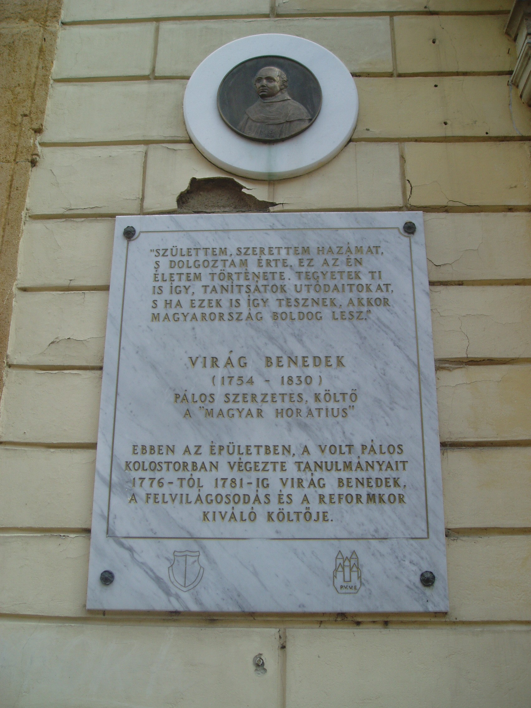 Nyilvános 1445 | 2020 | Pécs, Király utca 44. | A volt pálos kolostor a mellette ma is álló templommal a XVIII. század közepén épült s Pécs egyik legjelentősebb barokk műemlékegyüttese. Mint a homlokzatán elhelyezett emléktáblán olvasható, 1776-81 között itt végezte iskoláit Virág Benedek költő. A fénykép 2006 júliusában készült. Felh. irod.: Csorba Csaba: Pécs. Bp. Panoráma, 1983 |