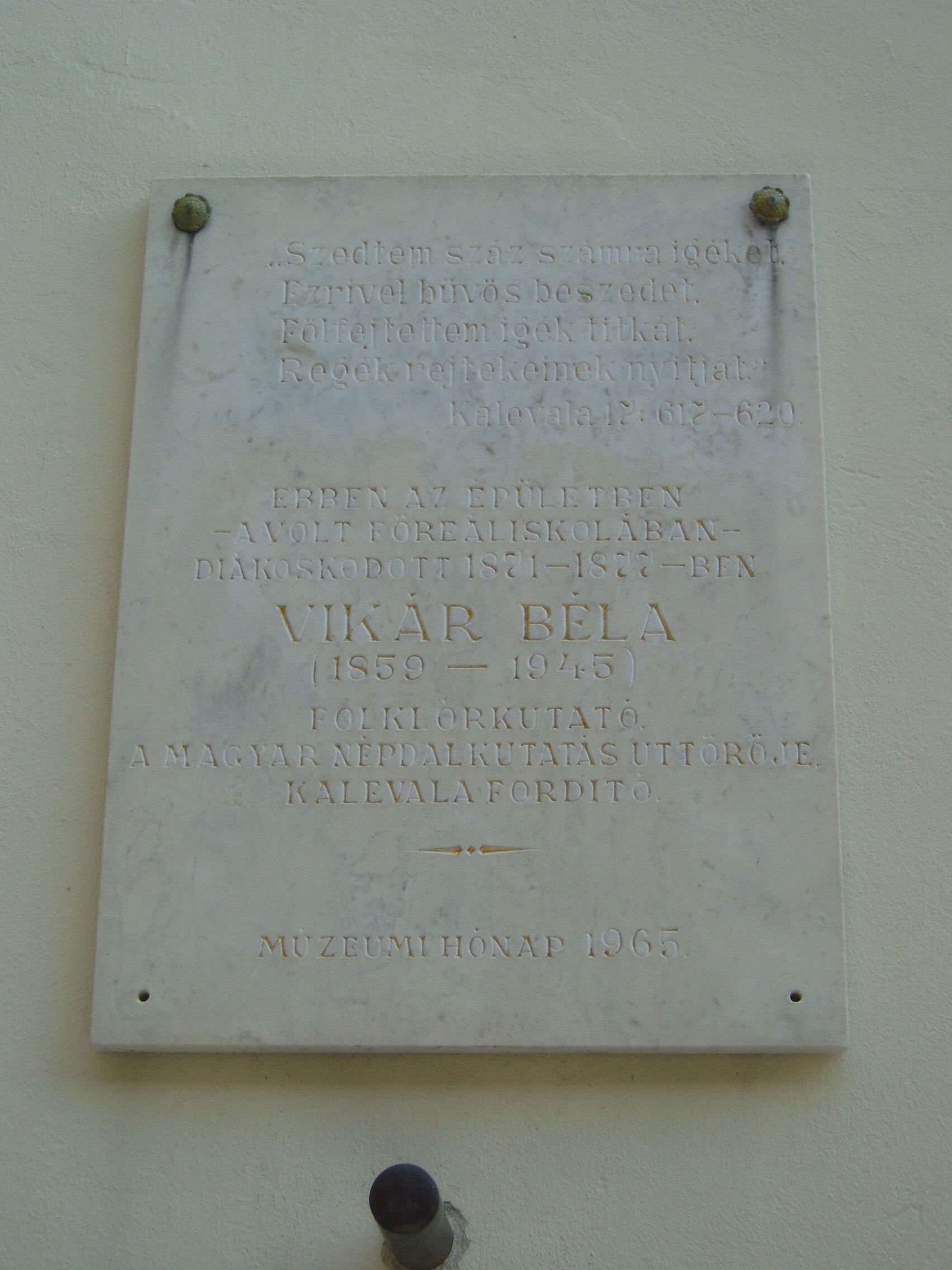 Nyilvános 1453 | 2010 | Pécs, Mátyás király utca 15. | Egyemeletes, mai állapotában kora eklektikus épület. Egykori barokk külsejére már csak a kapuja felett lévő címer — Klimó püspök címere — utal. 1743-ban apácazárdának épült, majd főreáliskola, polgári fiúiskola, zeneiskola és zenekonzervatórium lett. Ide járt iskolába 1871-77 között Vikár Béla. A Kalevala kiváló fordítójára az épületen elhelyezett tábla emlékezik. A fénykép 2006. júliusában készült. Felh. irod.: Csorba Csaba: Pécs. Bp. Panoráma, 1983 Takáts Gyula: Vikár Béla emléktáblájánál. = T. Gy.: Egy kertre emlékezve. Bp. 1971, Szépirodalmi Kiadó |