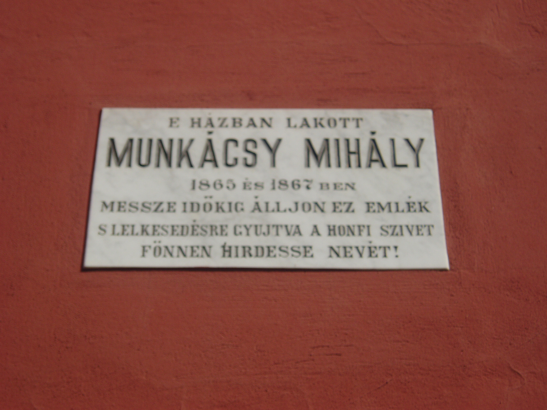 Nyilvános 1506 | 2002 | Pécs, Munkácsy utca 31. | A romantikus stílusú, földszintes lakóházon Munkácsy Mihály emléktáblája olvasható. 1865-ben és 1867-ben itt szállt meg rokonainál pécsi tartózkodásai idején. A fénykép 2006 júliusában készült. Felh. irod.: Csorba Csaba: Pécs. Bp. Panoráma, 1983 |