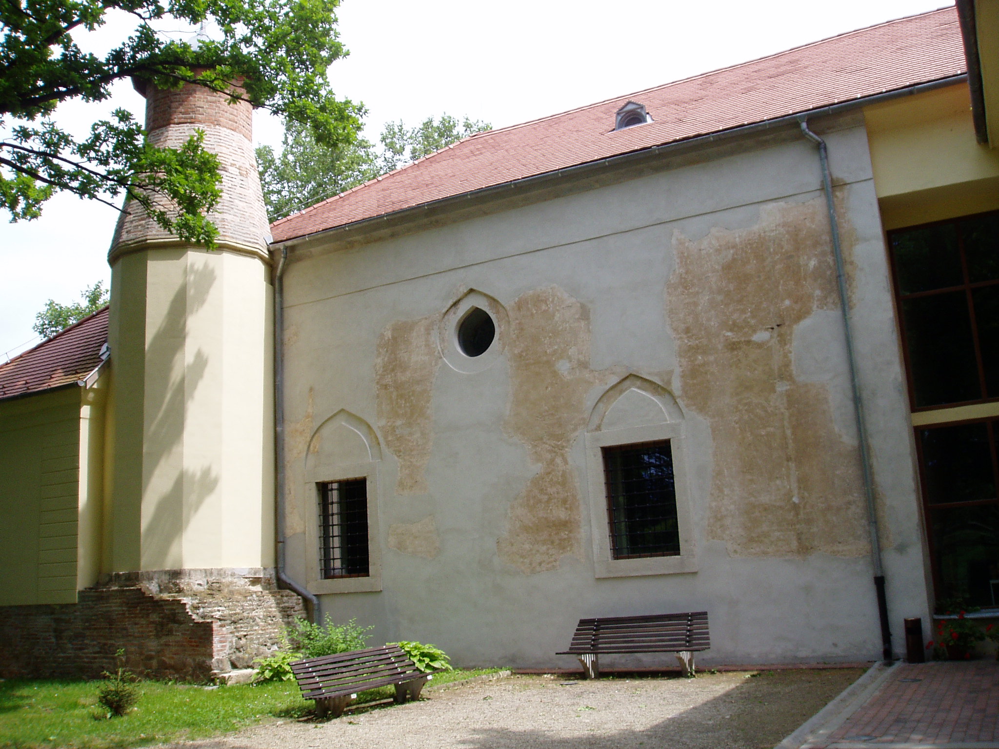 Nyilvános 1727 | 3265 | Szigetvár, Vár: dzsámi | A vár egyik központi épülete a Szulejmán dzsámi, amely a győztes szultán tiszteletére épült a XVI. században. A téglalap alaprajzú dzsámi Mekka felé néző oldalán látható a kőkeretes, egykor csempével borított, szalaktit boltozatú imafülke (mihrab). A dzsámit L alakú folyosó veszi körül, ennek délkeleti oldalán egy másik mihrab fülke található. Északnyugaton csatlakozik a dzsámihoz a szabályos tizennégyszög alakú minaret, amelynek nagy része a XVIII. században leomlott. A fénykép 2005 júniusában készült. Felh. irod.: Török műemlékek Magyarországon. = www.terebess.hu/keletkultinfo/minaret/szigetvar.html |
