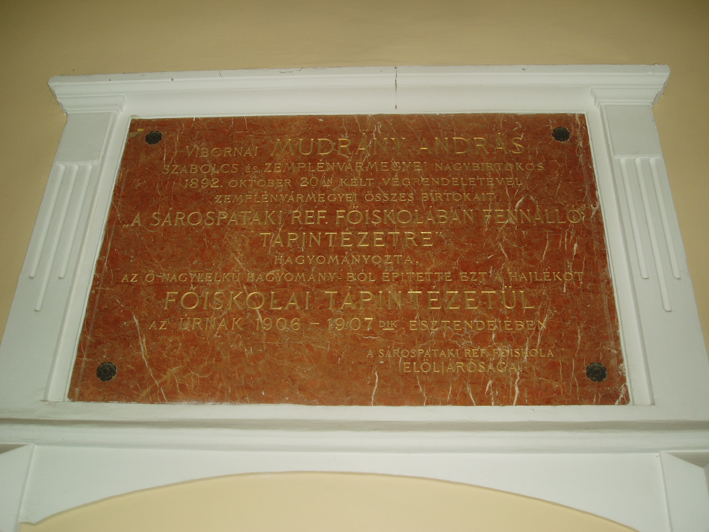 Nyilvános 1895 | 3893 | Rövid leírás | Teljes leírás (421 B) | Sárospatak, Comenius utca 1. Ez volt a pataki kollégium (lásd: Sárospatak, Rákóczi u. 1.) ún. tápintézete, azaz menzája, étkezdéje. Mint emléktáblájáról megtudható, Mudrány András adományából 1907-ben épült. A fénykép 2007 augusztusában készült. Felh. irod.: Látnivalók Borsod-Abaúj-Zemplén megyében. Miskolc, Well-PRess, 1995 |
