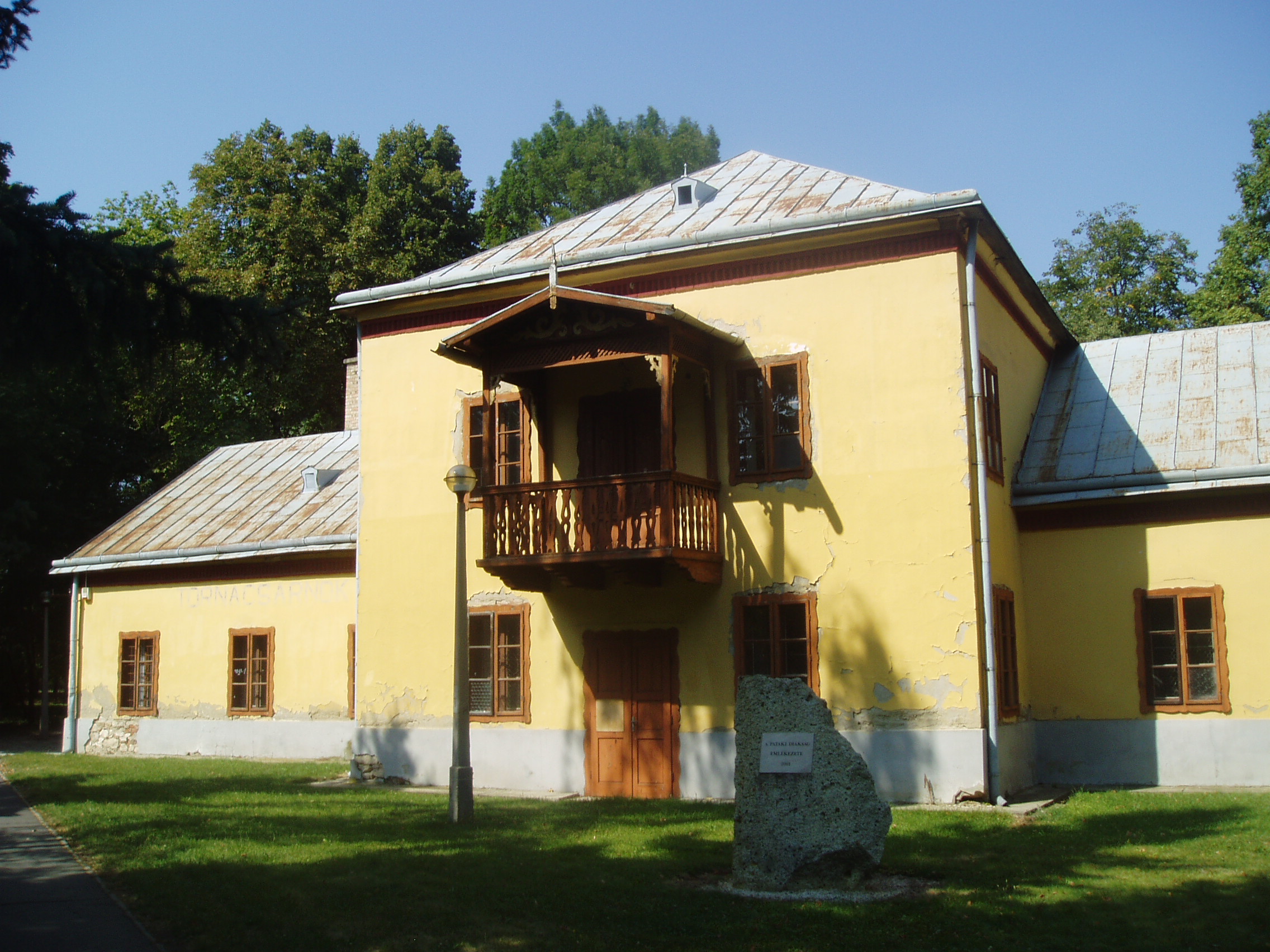 Nyilvános 1446 | 1980 | Sárospatak, Iskolakert: Tornacsarnok | A Református Kollégium (lásd: Sárospatak, Rákóczi u. 1.) bejáratával szemben találjuk az Iskolakertnek nevezett parkot. Az 1980-as években természetvédelmi területté nyilvánított Iskolakert sajátos nemzeti érték, mely egyedülálló az országban. Területén építették meg 1878-ban a kollégium tornacsarnokát, melyet az ország legrégibb tornatermének tartanak. Patak régóta fontos feladatnak tekintette a tanulók testi nevelését. Már 1838-ban játékteret alakítottak ki a diákoknak. S bár hazánkban a szertornázás kezdetét csak 1868-tól számítják, Patakon már 1854-ben használták a gimnasztikai szereket. A tornacsarnok, korabeli szóval "testgyakorda" építésével a kollégium megelőzte a Pesti Nemzeti Tornaegylet megalakulását. 1868-ban uszodát is építettek. A kollégium alsóbb osztályaiban a testgyakorlat már 1853-tól rendes tantárgy volt, amit az állam csak 1868-ban tett kötelezővé. Más szempontból is gondoltak az egészségvédelemre: 1791-től a kollégiumnak külön iskolaorvosa volt, s itt létesült 1863-ban az első magyar iskolai kórház is. A fénykép 2007 augusztusában készült. Felh. irod.: Ködöböcz József: Lakóhelyünk Sárospatak és körzete. Sárospatak, 2000 |