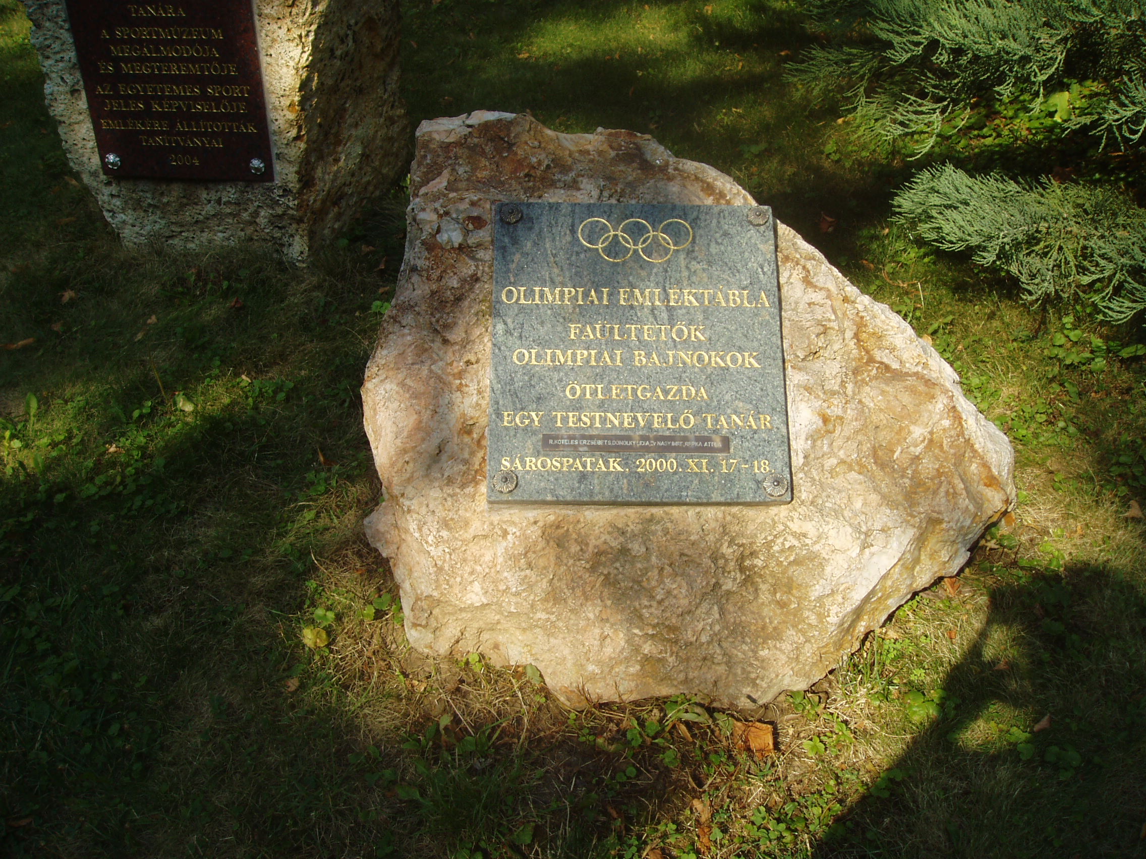 Nyilvános 1408 | 1983 | Sárospatak, Iskolakert: A pataki diákok emlékezete | A Református Kollégium (lásd: Sárospatak, Rákóczi u. 1.) bejáratával szemben találjuk az Iskolakertnek nevezett parkot. Az 1980-as években természetvédelmi területté nyilvánított Iskolakert sajátos nemzeti érték, mely egyedülálló az országban. Sétányai mentén Patakhoz kötődő jeles személyiségek szobrai állnak. Az iskolakertben álló műemlék tornacsarnok közelében is elhelyeztek néhány feliratos emlékkövet. A képen a 2000-ben felállított Olimpiai emléktábla látható. A fénykép 2007 augusztusában készült. Felh. irod.: Látnivalók Borsod-Abaúj-Zemplén megyében. Miskolc, Well-PRess, 1995 |