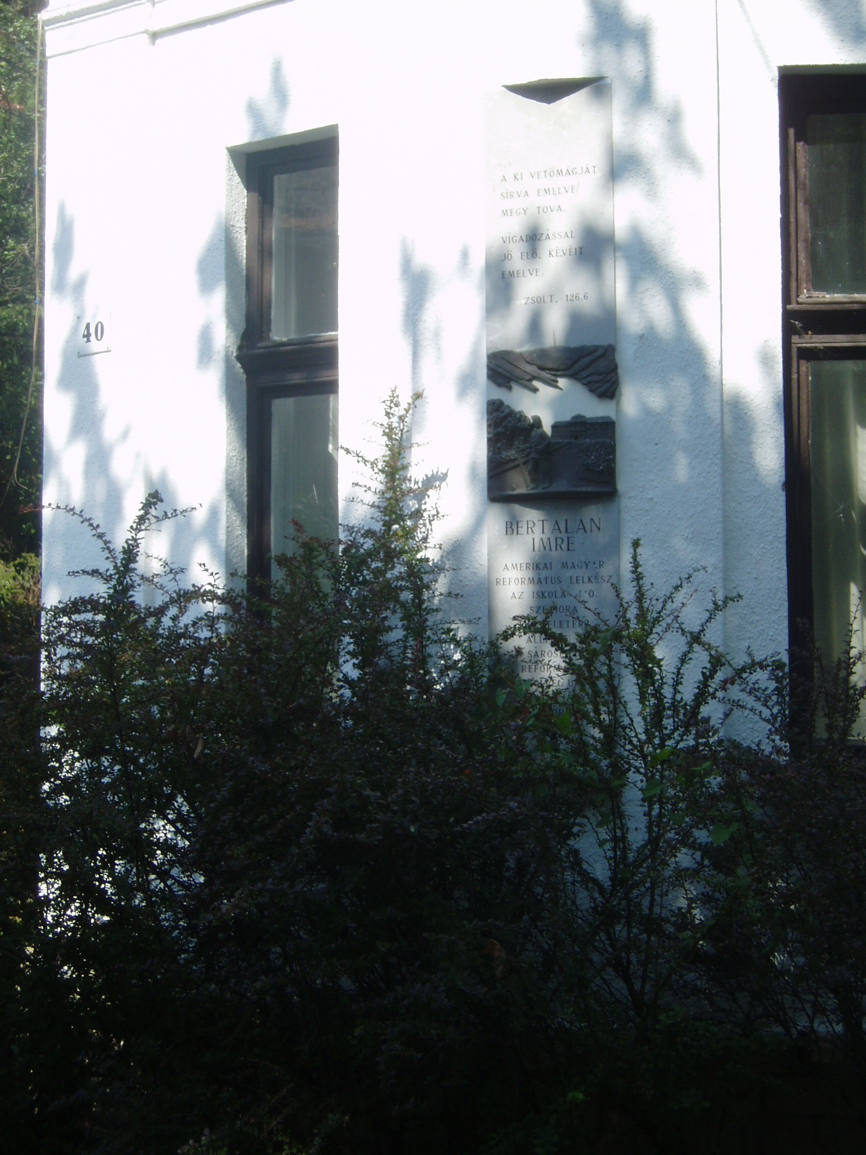 Nyilvános 1418 | 2080 | Sárospatak, Kazinczy utca 40. | Az Öregdiák vendégház, más néven Bertalan-ház homlokzatán Bertalan Imre amerikai-magyar lelkipásztor, a Református Kollégium (lásd: Sárospatak, Rákóczi u. 1.) 340. szeniora emléktáblája látható. Bertalan Imre az 1940-es évek elején volt pataki diák. A Kazinczy utcai lakóházat, ő adományozta volt iskolájának. Az épületet a kollégium alapítványa vette gondozásába, amely a mai és az öregdiákok különböző összejöveteleinek színhelyéül szolgál - a tudományos előadásoktól az öregdiák találkozókig. A fénykép 2007 augusztusában készült. Felh. irod.: Hű maradt Patakhoz. = www.patakidiak.hu/bertalan/ |