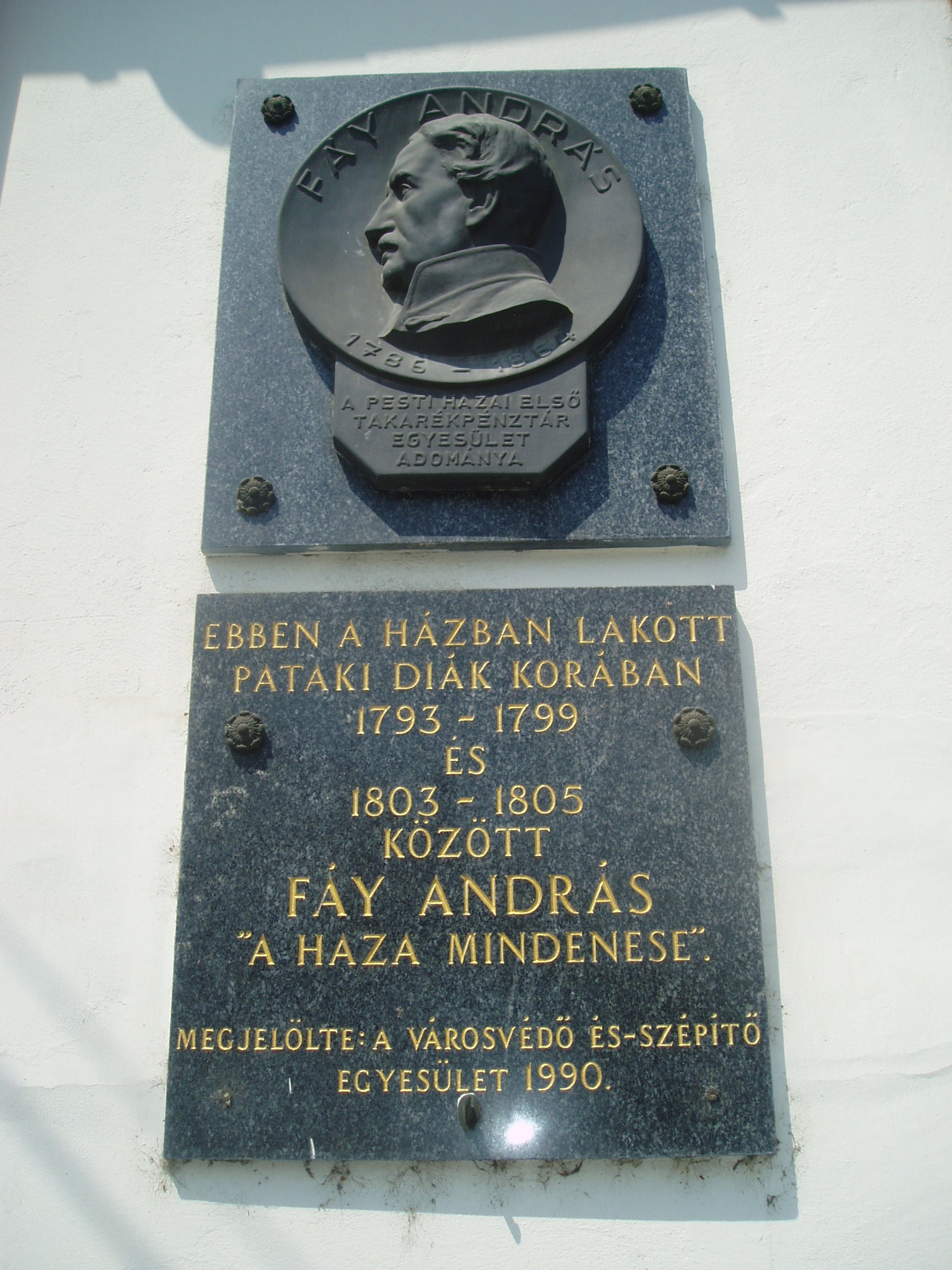 Nyilvános 1368 | 1992 | Sárospatak, Kossuth utca 22. | A homlokzatán 1990-ben elhelyezett emléktábla tanúsága szerint ebben a házban lakott pataki diák korában, 1793-1799 és 1803-1805 között Fáy András, "a haza mindenese", Alakját az Iskolakertben mellszobra idézi (lásd: Sárospatak, Iskolakert: Fáy András). A fénykép 2007 augusztusában készült. |